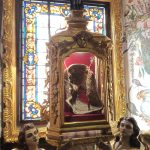 El Camarín de forma rectangular de siete varas de largo por seis de ancho y cinco de altura, sobre un suelo de jaspes de Lanjarón, mármol blanco de Macael y negro de Sierra Nevada, se alza el trono elaborado en madera tallada, en cada una de sus cuatro caras, hay tres jaspes de Málaga, sostenido por ocho columnas con capiteles de orden corintio. En cada una de las columnas hay una estatua de plata repujada que, con otras cuatro que hay en otras repisas salientes, representan los doce apóstoles, están presididos por la imagen del Maestro de pie y levantando la cruz, descansa sobre la cupulilla de este trono. Fueron realizados por el italiano Bartolomé Baroni. En el espacio que forman las ocho columnas, están las reliquias de San Juan de Dios, guardadas en una urna de plata repujada. Sobre la que resalta de pie, el Arcángel San Rafael. Una vez más, hoy hemos disfrutado de un nuevo grano de nuestra Granada, gracias al programa “Desgranando Granada de la asociación ALUMA.