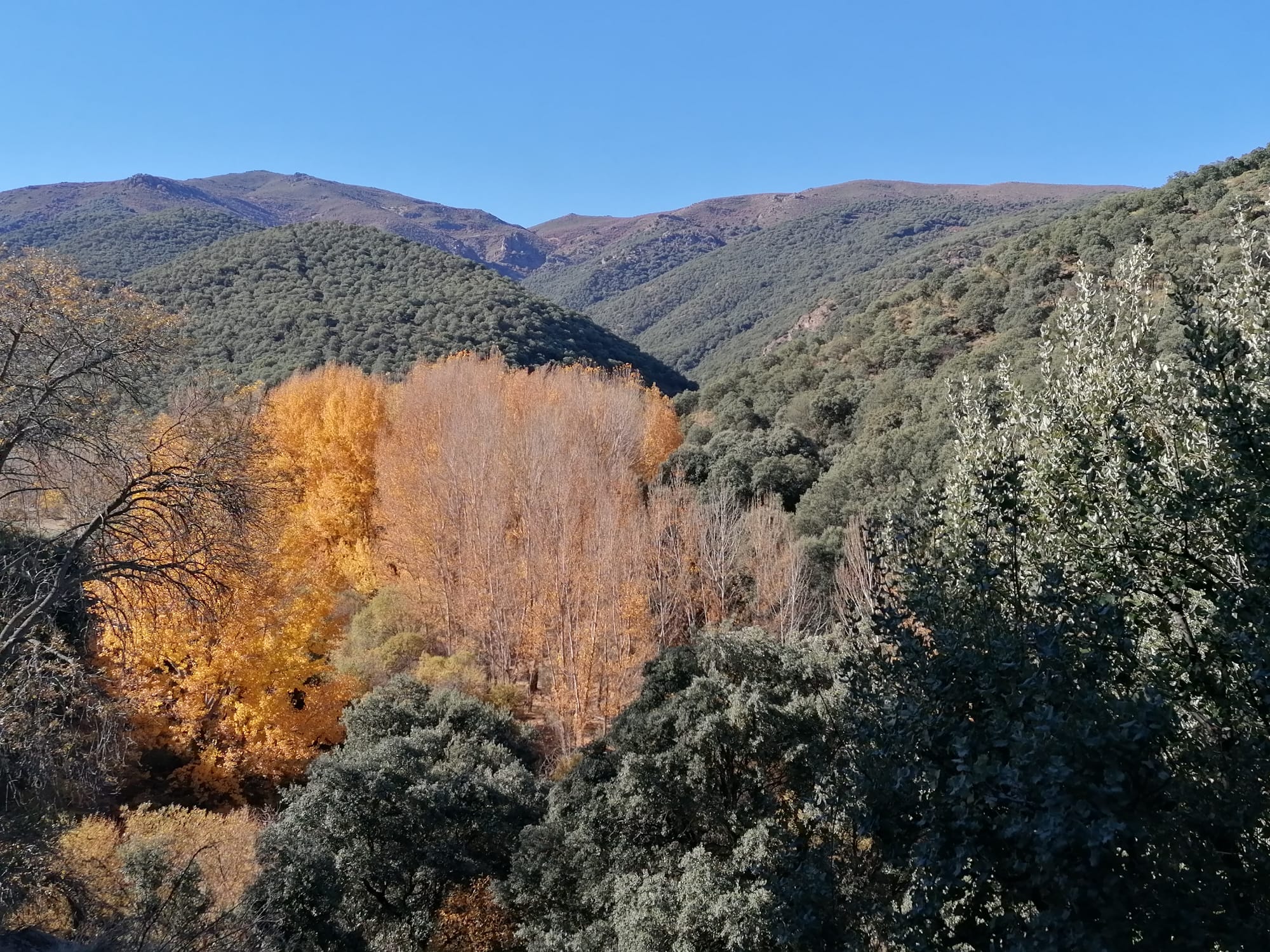 Un suave viento sopla, sube por el seco arroyo y remueve las hojas amarillas de los esbeltos álamos. Llueven hojas, lluvia dorada, llueve en el seco otoño. Quedamos encadenados con la mirada en el continuo revuelo de hojas caducas, extasiados en sentir el imán de la naturaleza en su plenitud que se prepara para dormir el largo invierno.