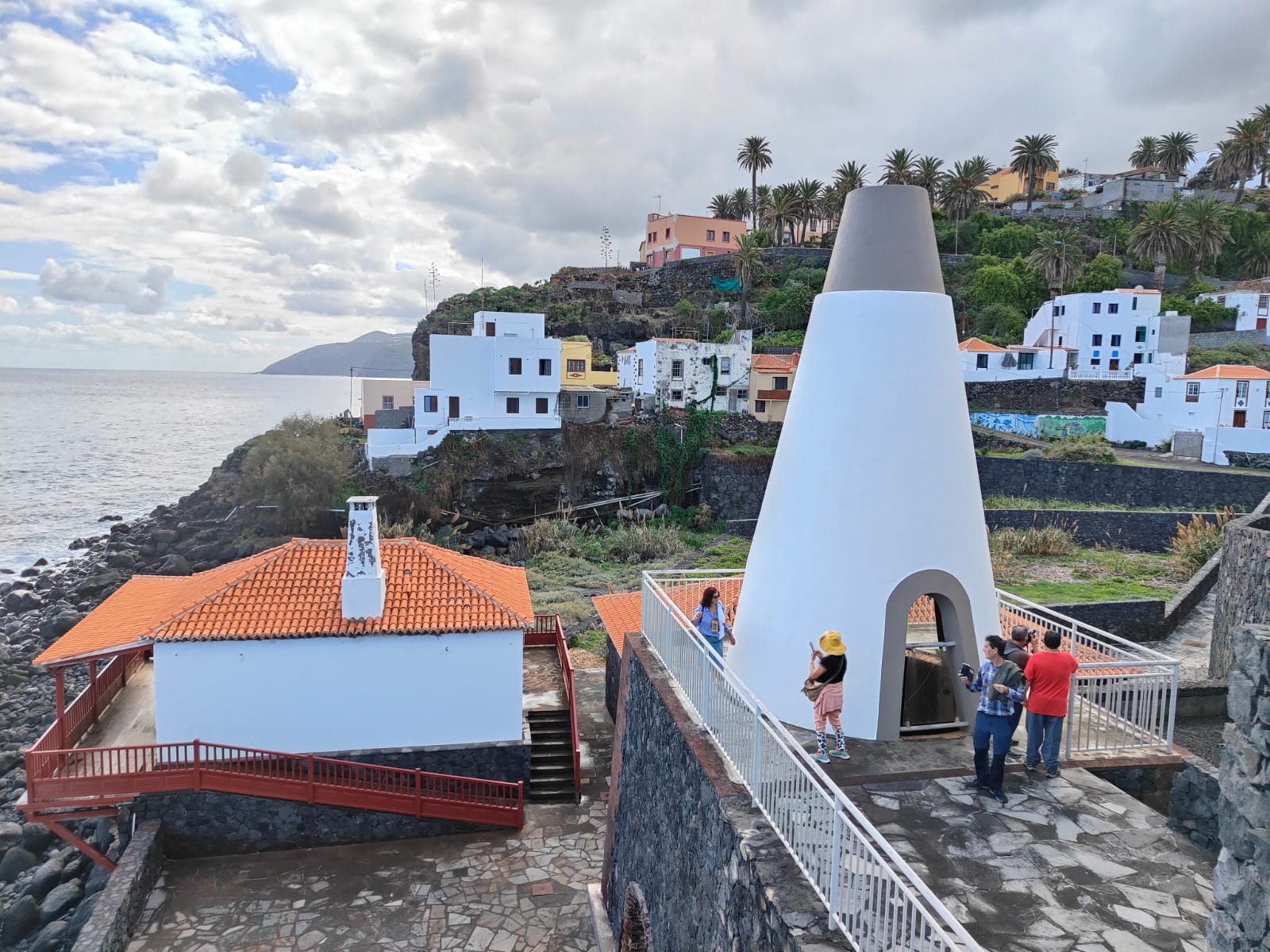 Nos dirigimos en primer lugar, al Mirador del Risco de la Concepción, cono volcánico donde ha interactuado el agua del mar con el magma, presenta forma de herradura. Desde allí, una excelente vista panorámica de la Breña Alta y en la base Santa Cruz de la Palma… allí Jaime nos explica la acción de los vientos alisios, que dulcifican su clima y favorecen su vegetación.