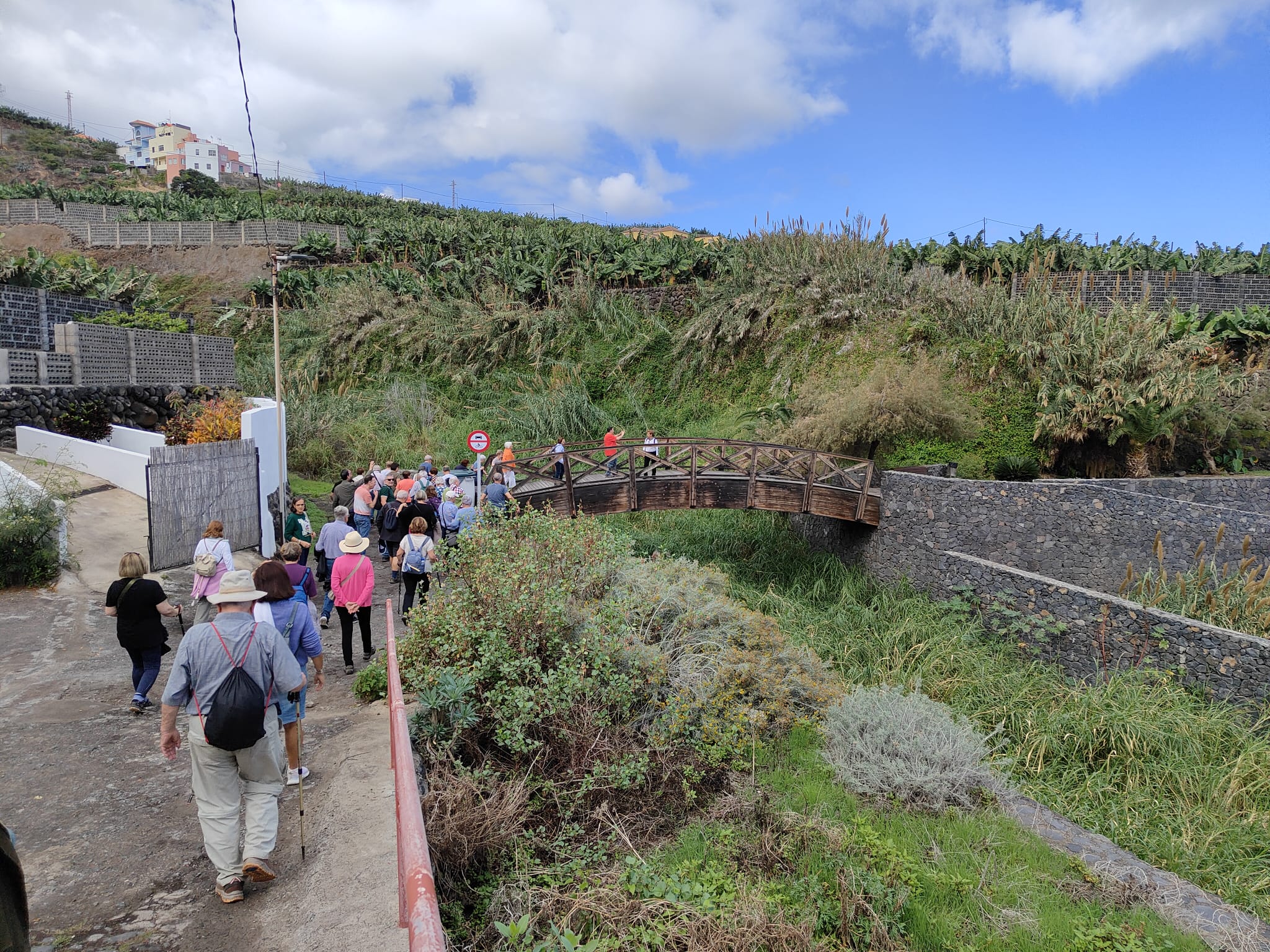 Por el camino hacia Fuencaliente, donde tenemos el almuerzo vamos observando a ambos lados de la carretera casitas pintadas de colores que sin perder la estética embellecen el recorrido. Y Cómo no? seguimos viendo plantas ,unas tan importantes como el drago, de alto valor simbólico y cultural en Canarias, que se utilizaban para fabricar objetos para el campo o la “sangre de drago” como tinte; y otras , las plataneras, que ocupan grandes extensiones hasta la misma orilla del mar.