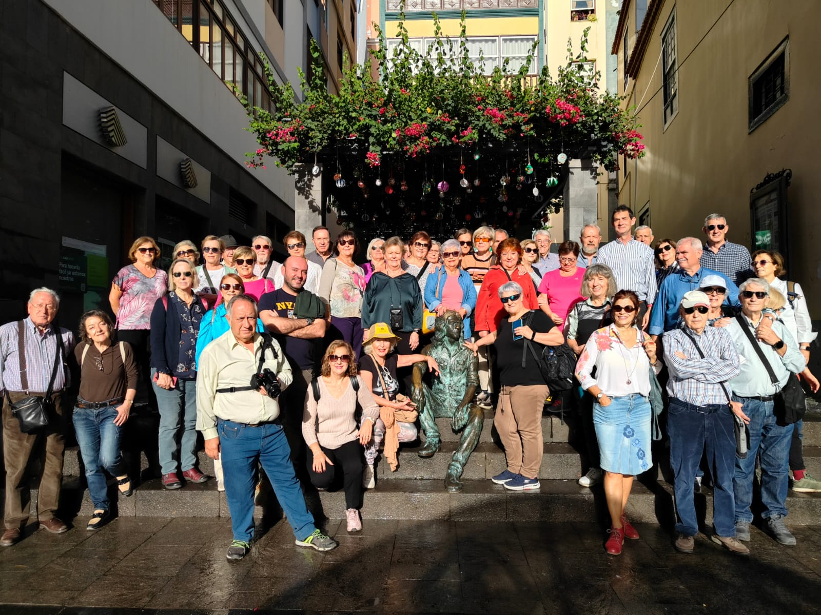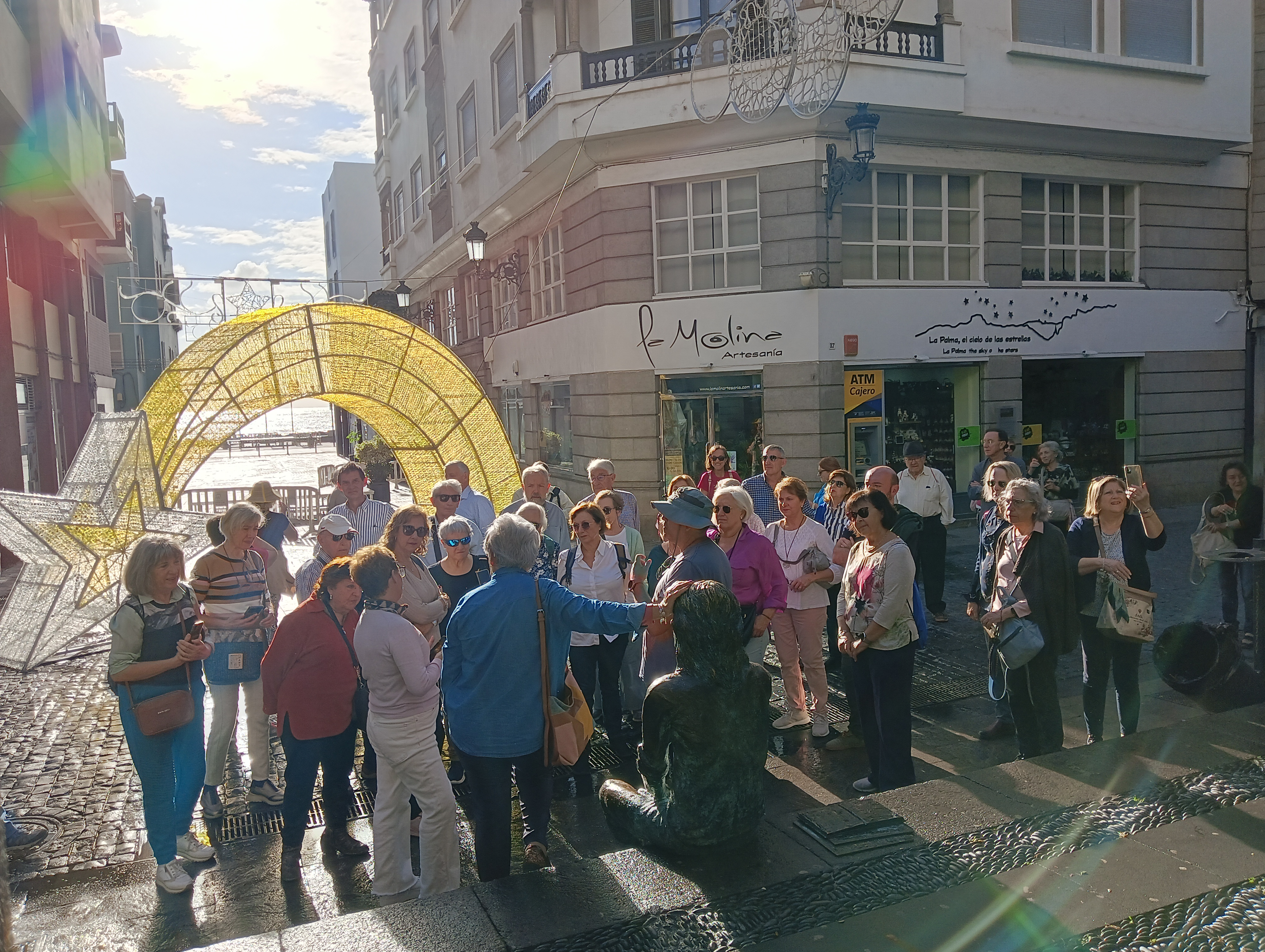 Muy cerca del Hotel, por el camino vamos contemplando casas de personajes famosos. Ya en la ciudad iniciamos la visita por la calle O’Dally, y nos detenemos delante de edificios construidos con rocas volcánicas muy interesantes y bonitos. Cabe mencionar un edificio donde se alberga la Diputación del Común, algo muy especial, lo que es hoy el Defensor del Pueblo parece ser que fue uno de los primeros organismos democráticos en la historia. Llegamos a la Plaza del Salvador con la Iglesia renacentista y un artesonado mudéjar espectacular. De aquí a la plaza de S. Francisco y a la Alameda, donde nos fotografiamos con la Estatua del Enano y el Barco de la Virgen.