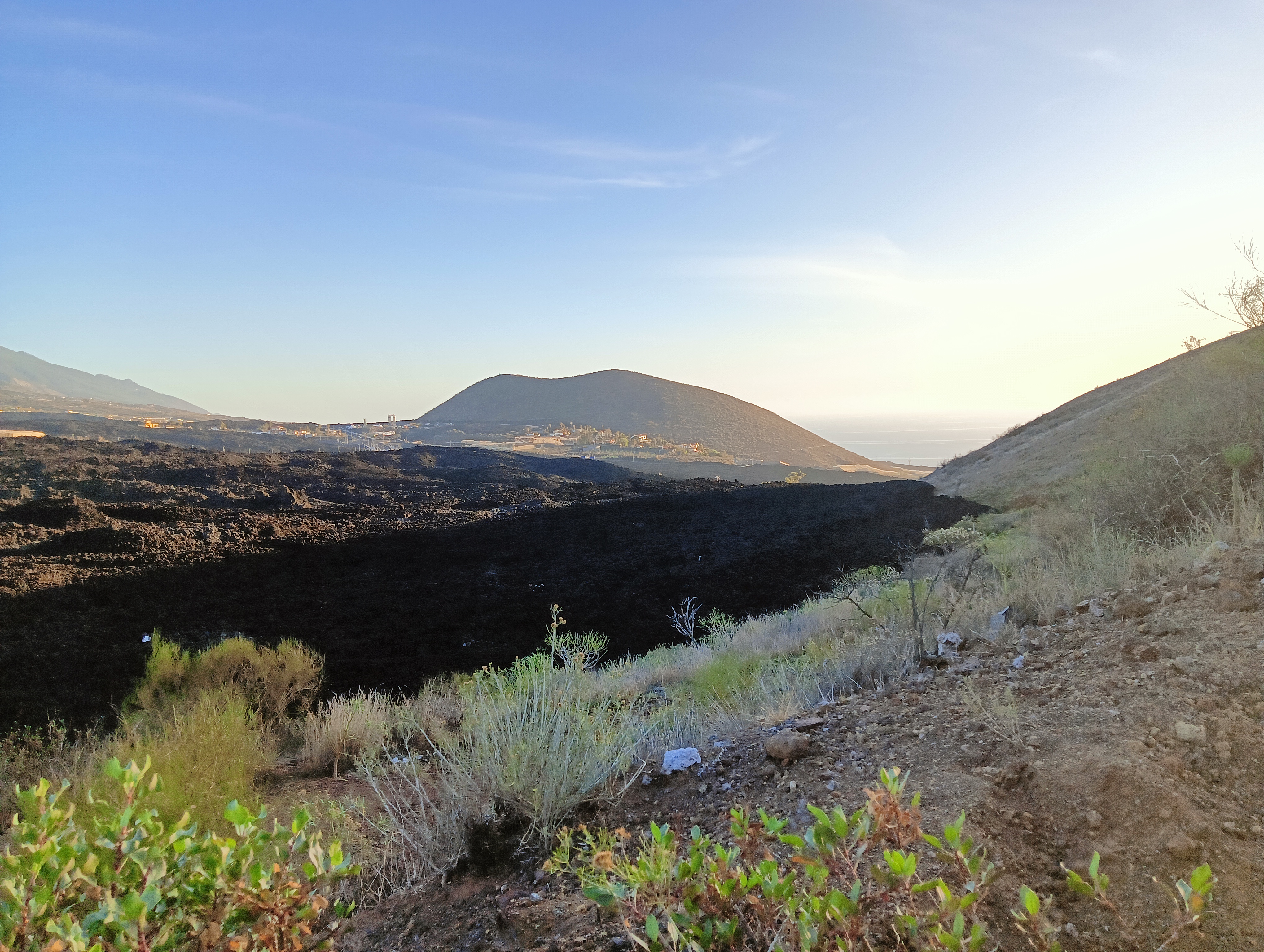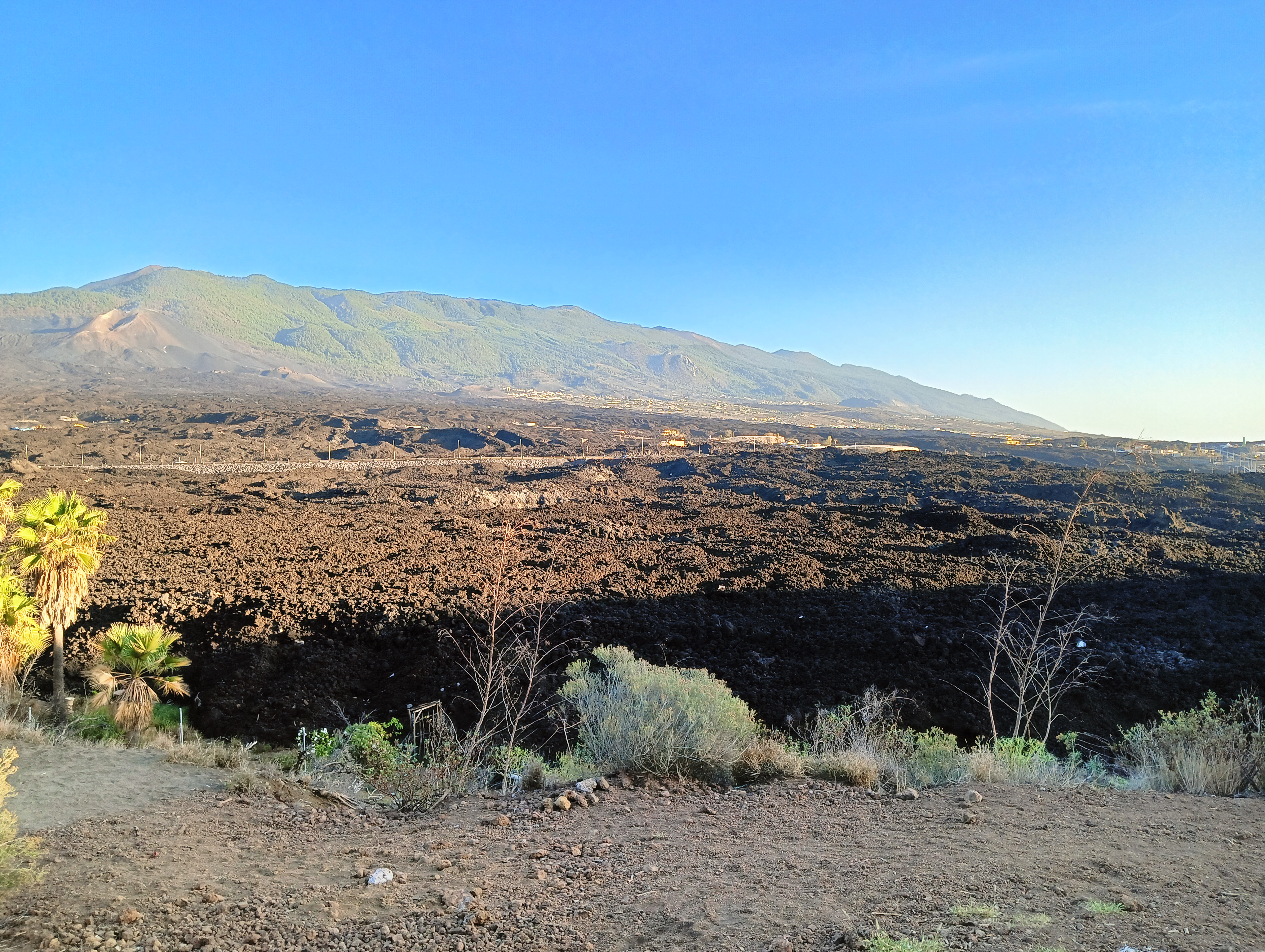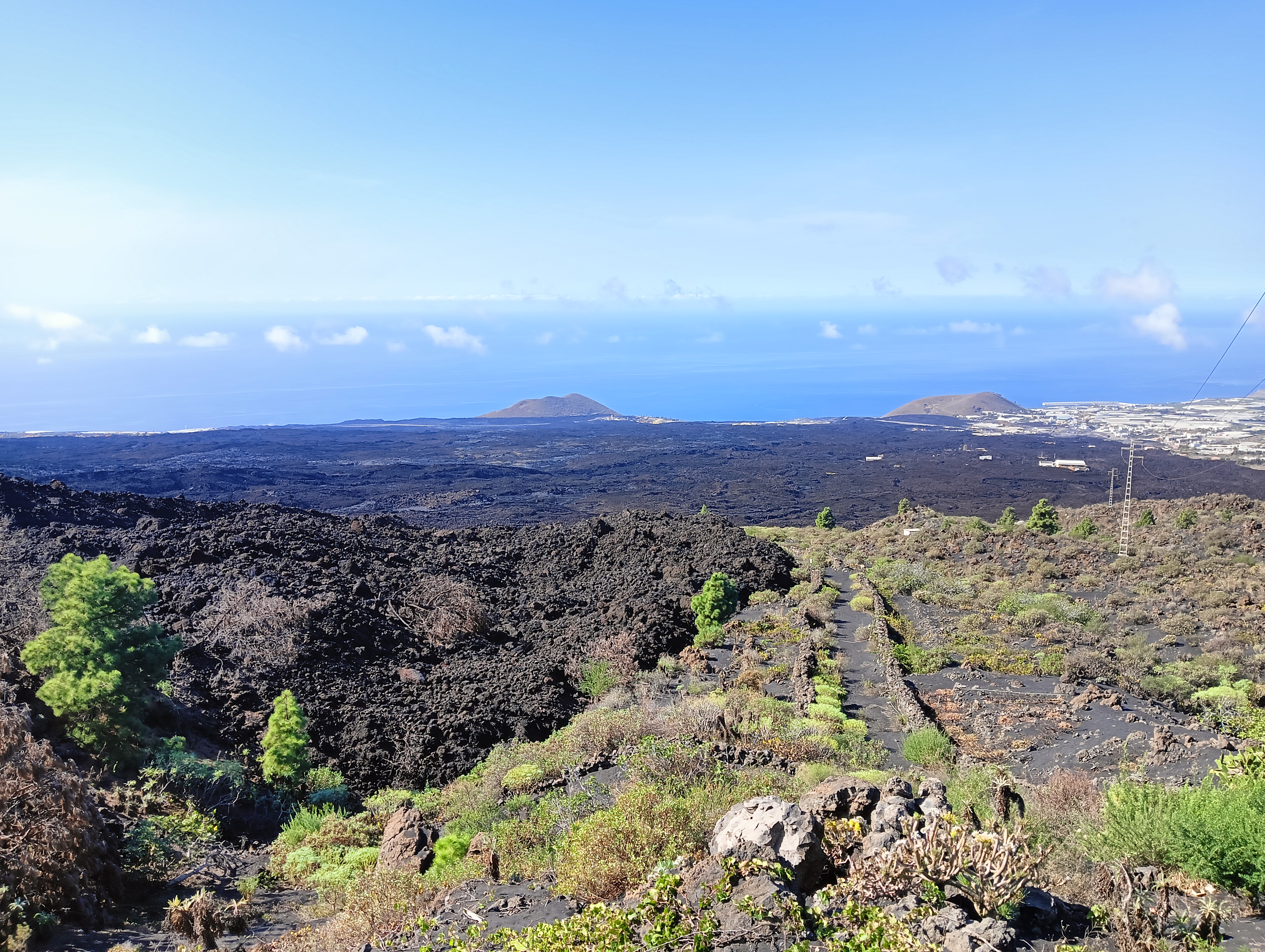 Llegados al punto cero, hay una valla que impide el paso y un paredón de lava de varios metros de altura cortando la carretera, desde lejos aún se ve el vapor de agua que todavía sigue arrojando el volcán por sus chimeneas. Impresiona toda la zona cubierta de negra lava ya solidificada formando coladas que llegan hasta el mar y hasta las casas más cercanas del barrio de la Laguna cercano al volcán. Algunas de las casas han sido sepultadas por completo y a otras les ha llegado la lava hasta la mismísima puerta del patio. Algunos vecinos ya han podido volver a sus casas, otros aún siguen refugiados en hoteles o en viviendas sociales.