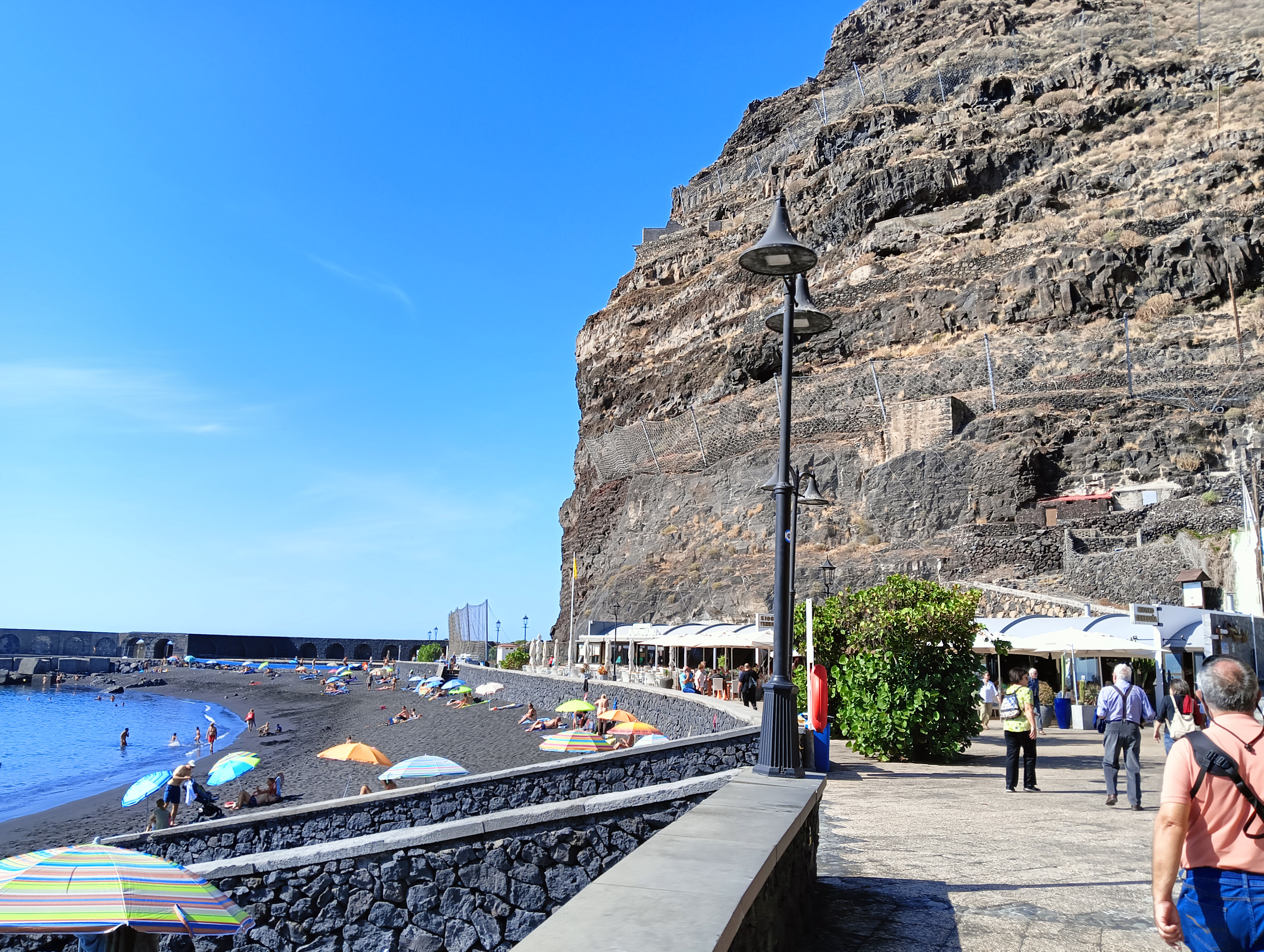 De aquí a Tazacorte, donde está prevista la comida en un restaurante de playa. Es un día de bastante calor, con gente bañándose o tumbada en las negras arenas…para nosotros desconocidas, y por tanto impresionantes.