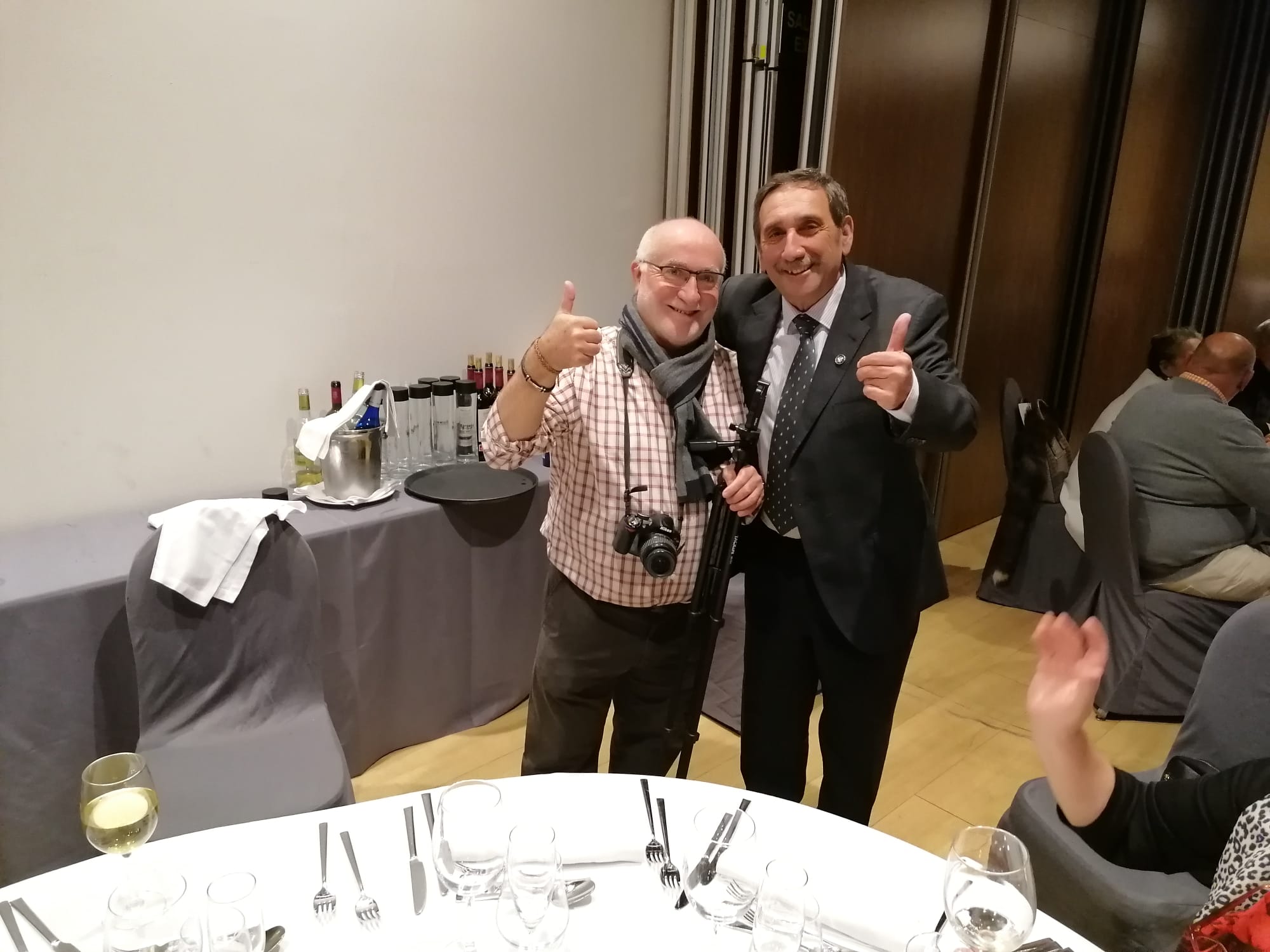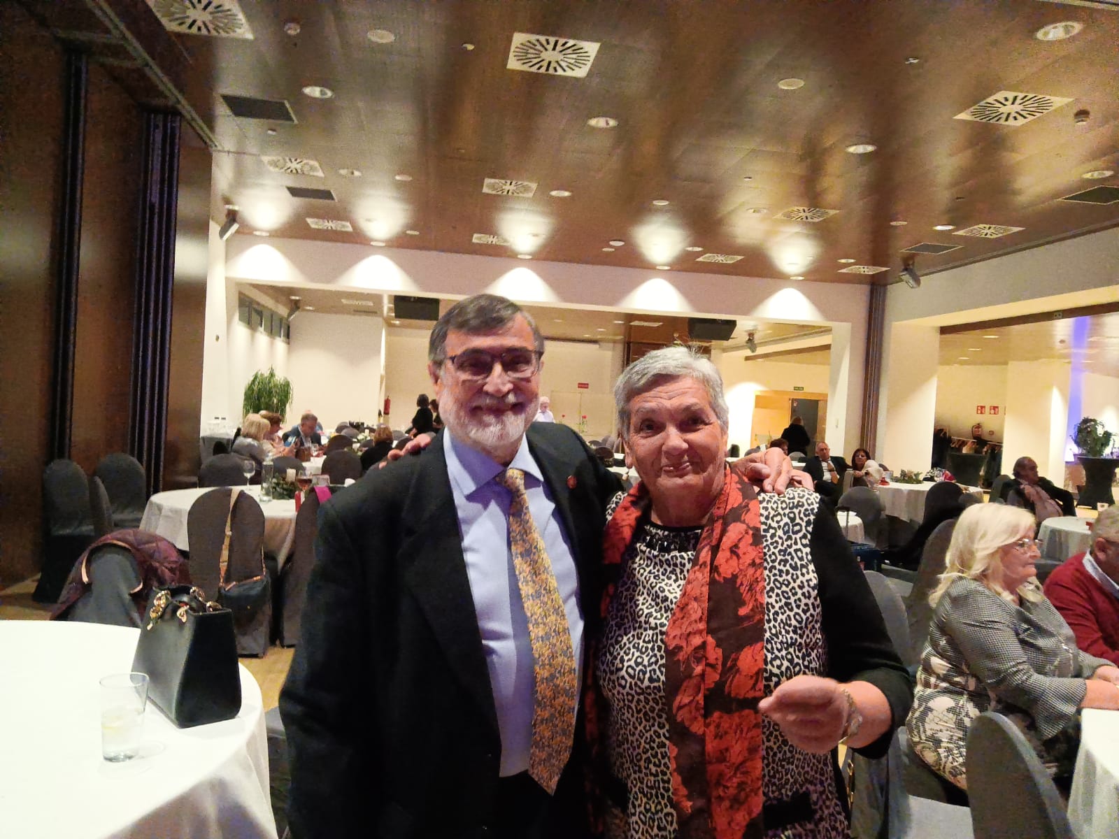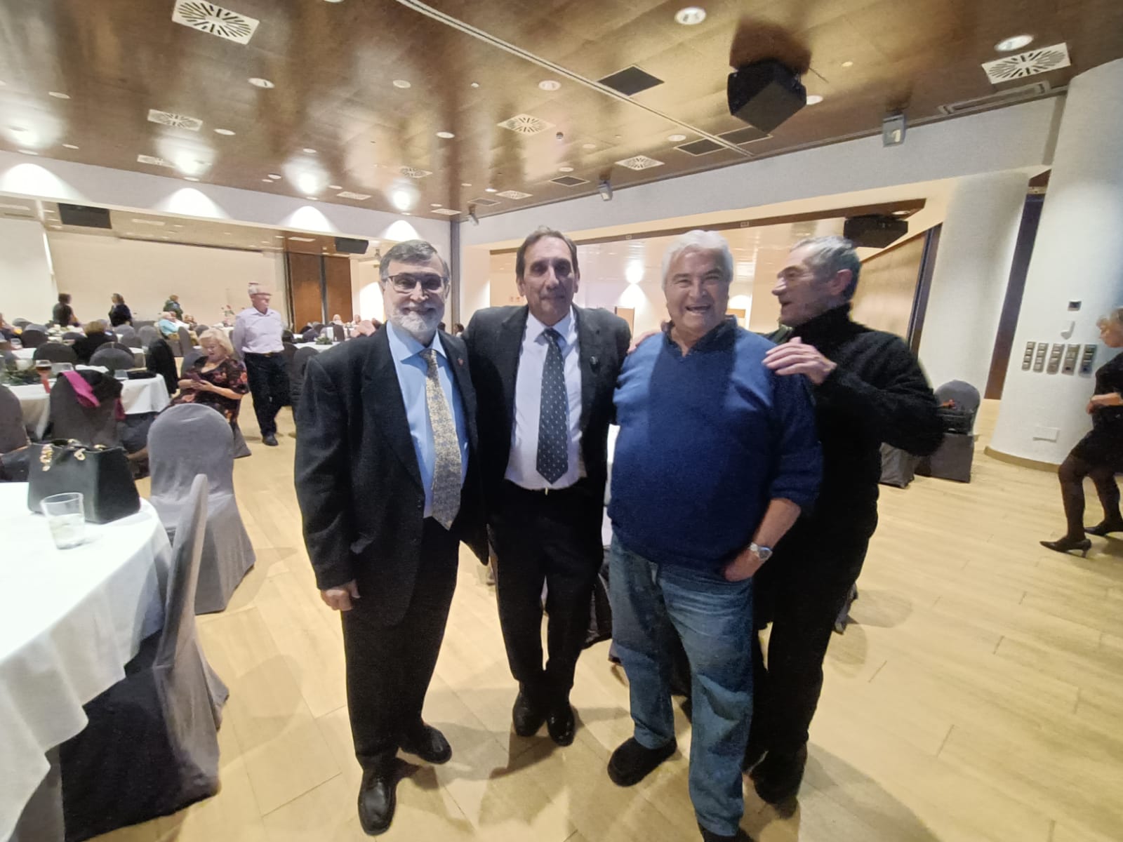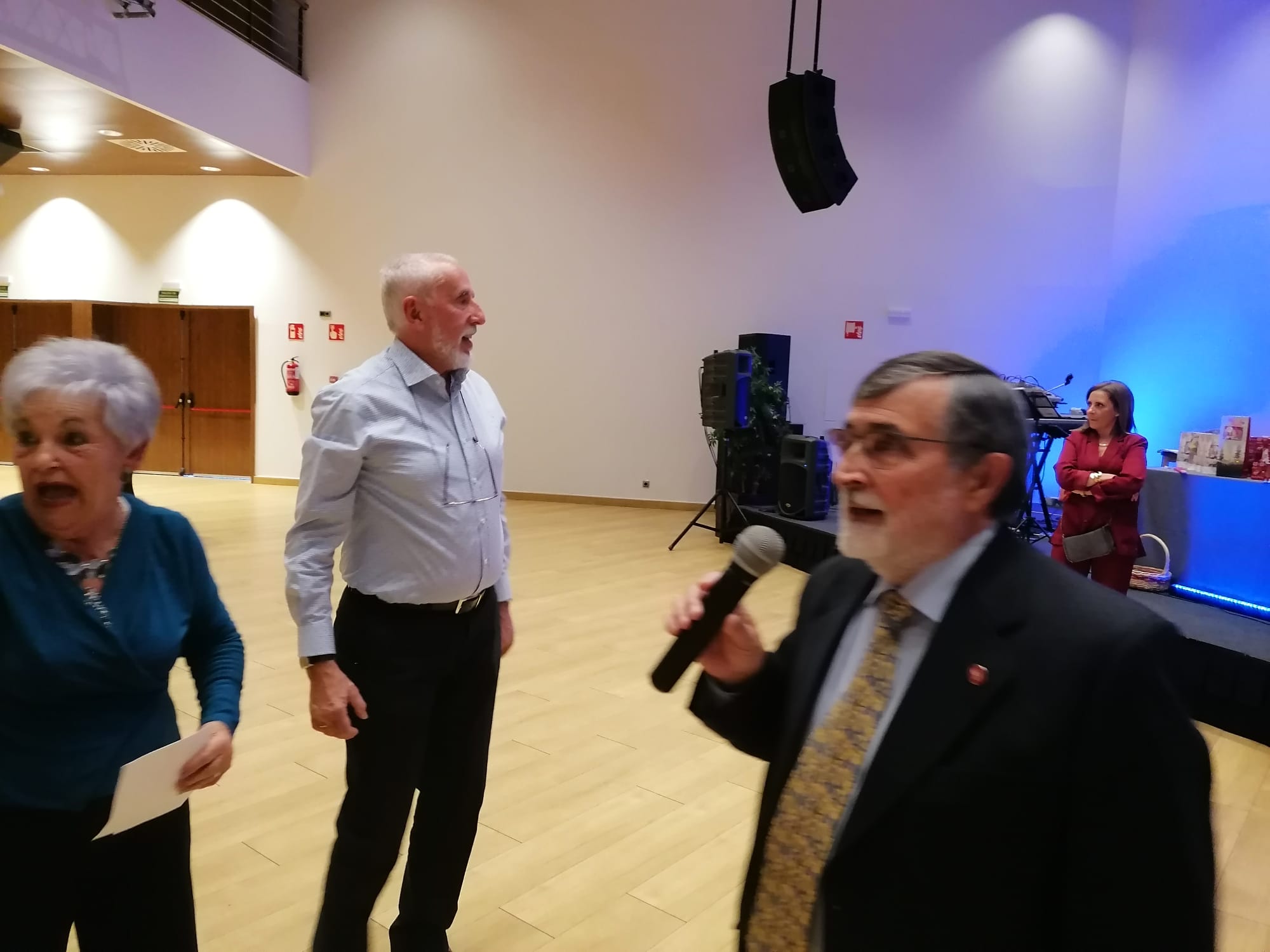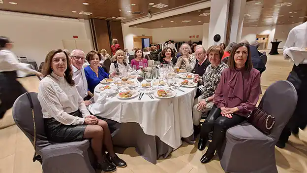 A continuación los participantes pasaron a las mesas para dar paso a la comida, comenzando con unos aperitivos calientes, (croquetas caseras de ave y piñones, pastela de canard, mini alcachofa con gambón y pistacho, mini Brioche, espeto de presa ibérica, mini tortilla de cebolla caramelizada…) continuando con carrillera al Pedro Ximénez, cremoso de patata y trufa, o salmón al horno sobre puré de coliflor, huevas y crujiente de puerro. De postre tarta de queso con culis de frutos rojos, todo ello regado con vinos blanco de Rueda y tinto de Rioja, finalizando con un brindis con cava y turrones.