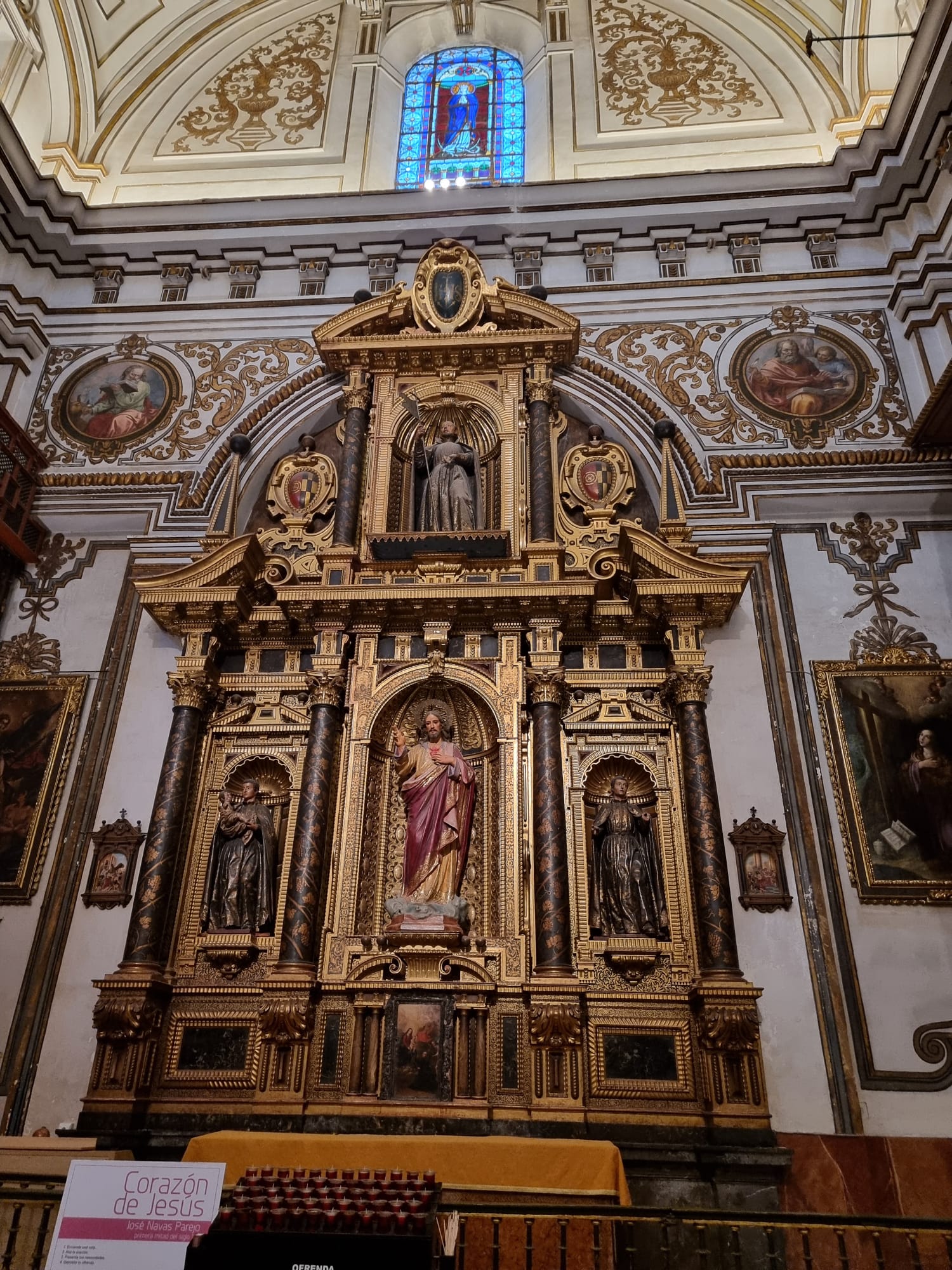 El interior del templo es un tesoro de riqueza artística, con un retablo giratorio en la capilla mayor, un órgano impresionante y frescos de Martín de Pineda que narran la vida de San Francisco Javier. Obras de José Risueño, Pedro Atanasio Bocanegra, Torcuato Ruiz del Peral, José de Mora, Diego de Mora, y Díaz de Rivero completan la colección.