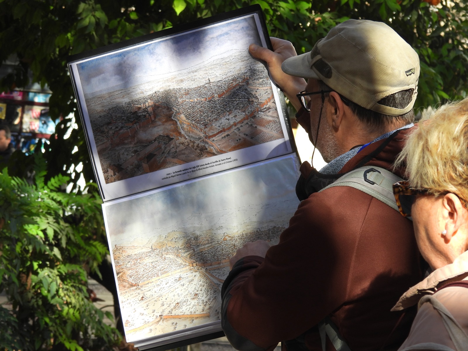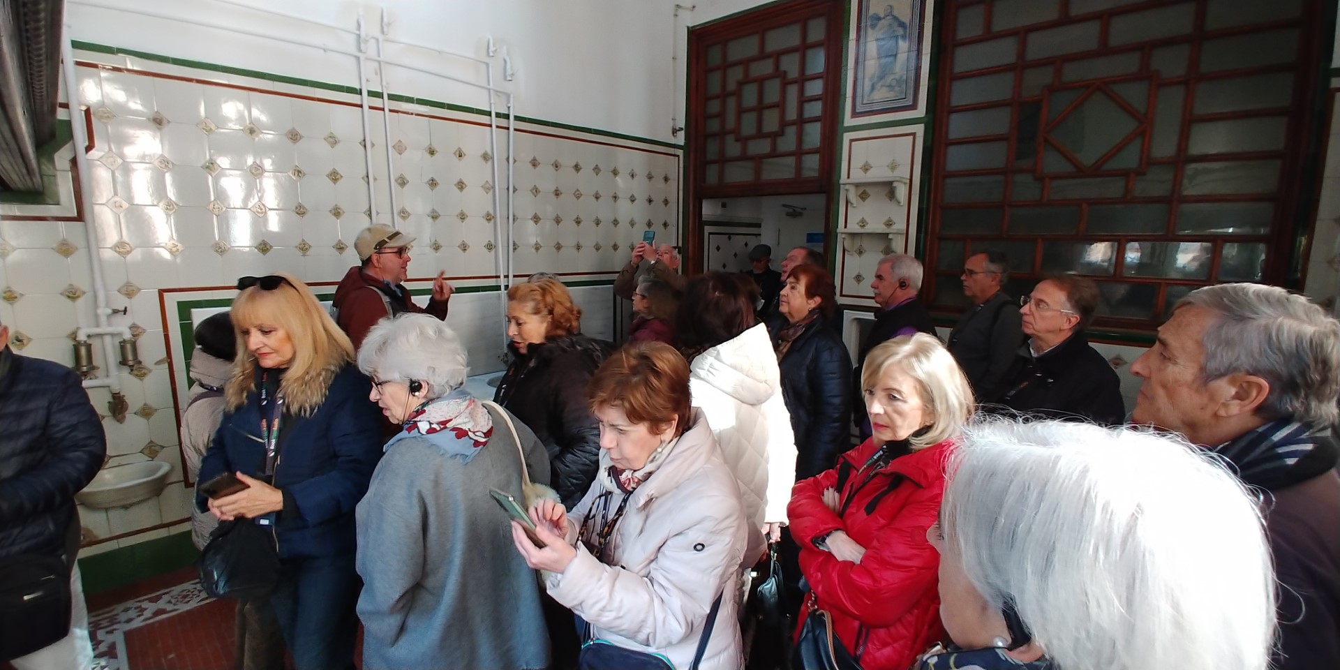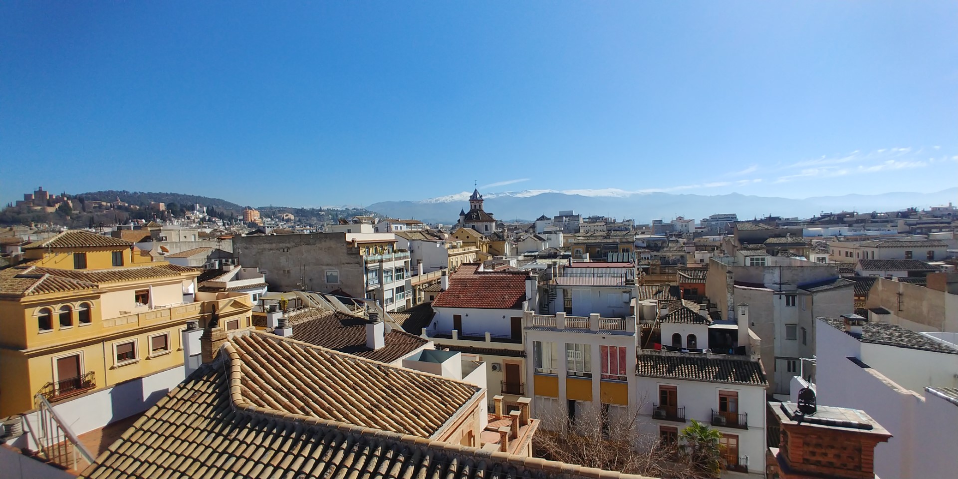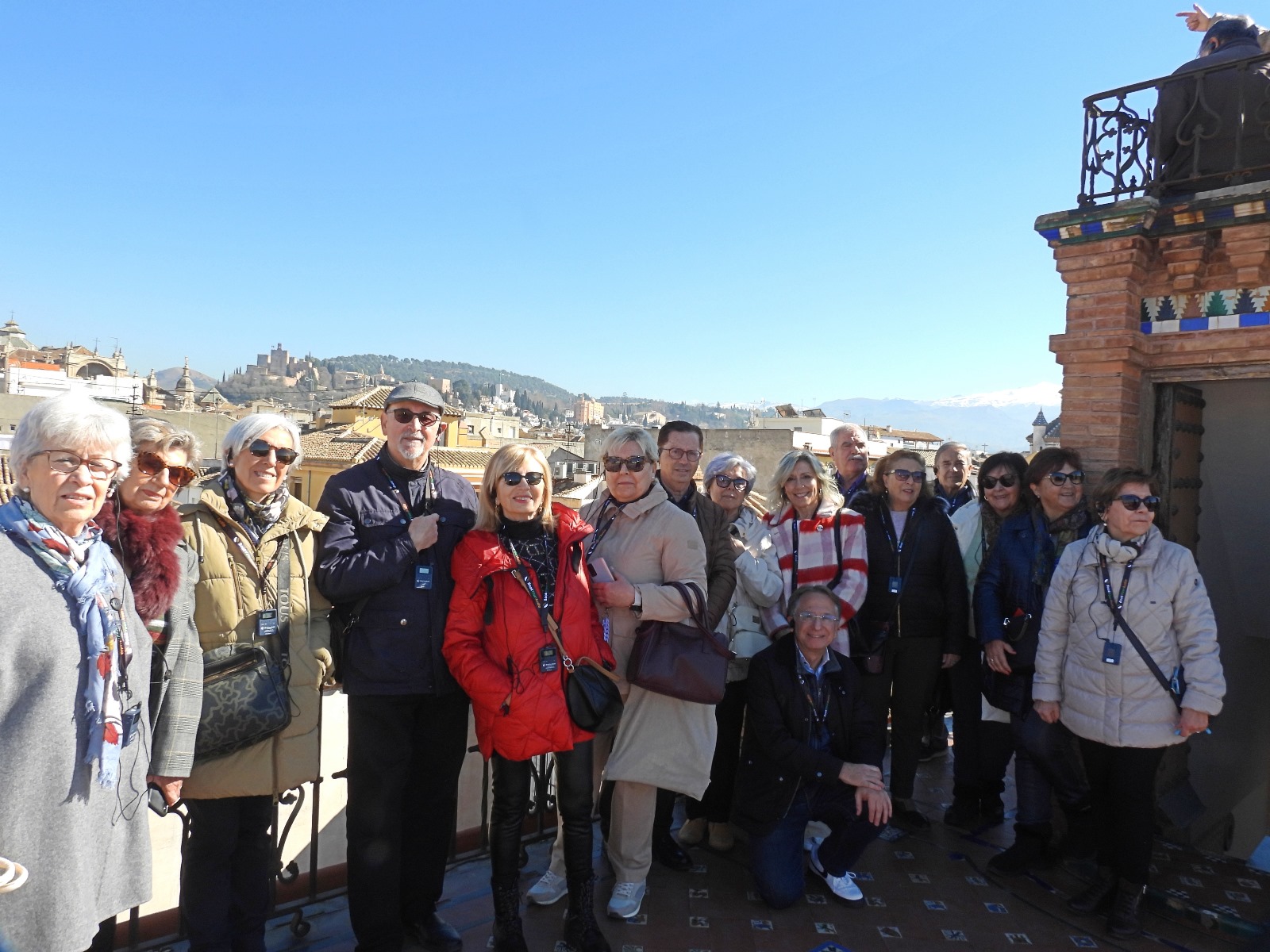 Entre las calles Buensuceso y Paz, descubrimos el palacio del Conde de la Jarosa, actual sede del Instituto Confucio y el Centro de Lenguas Eslavas. Al adentrarnos en su interior, quedamos impresionados por la arquitectura, los primorosos suelos de teselas y la sorprendente azotea, un auténtico mirador que ofrecía vistas panorámicas de Granada, Sierra Nevada, la Catedral, la Alhambra, el Albayzín, las cúpulas y torres de las iglesias, y los tejados. Las expresiones de admiración de los participantes no se hicieron esperar.