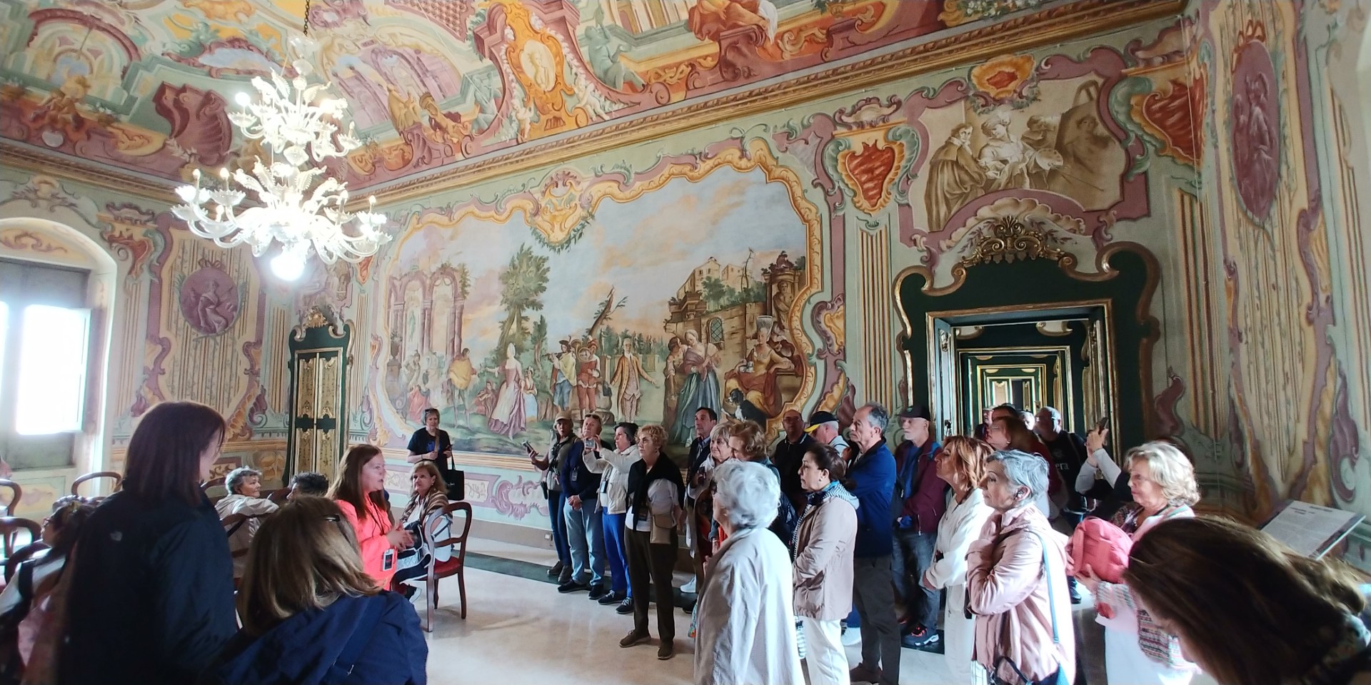 Amanece y la luz difusa se esparce en la tranquila, bella y barroca ciudad de Lecce. A la matina a la hora prevista en el monumental Convitto Palmieri (1699) nos esperaba el Presidente de UNITRE Lecce, Giovanni Diurisi, equipo directivo y compañeros italianos. Con saludos y abrazos de bienvenida entramos en una espectacular sala de conferencia decoradas con pinturas murales de gran formato.