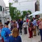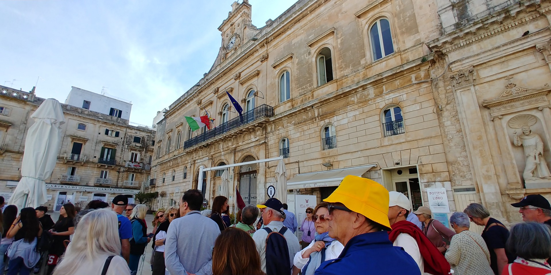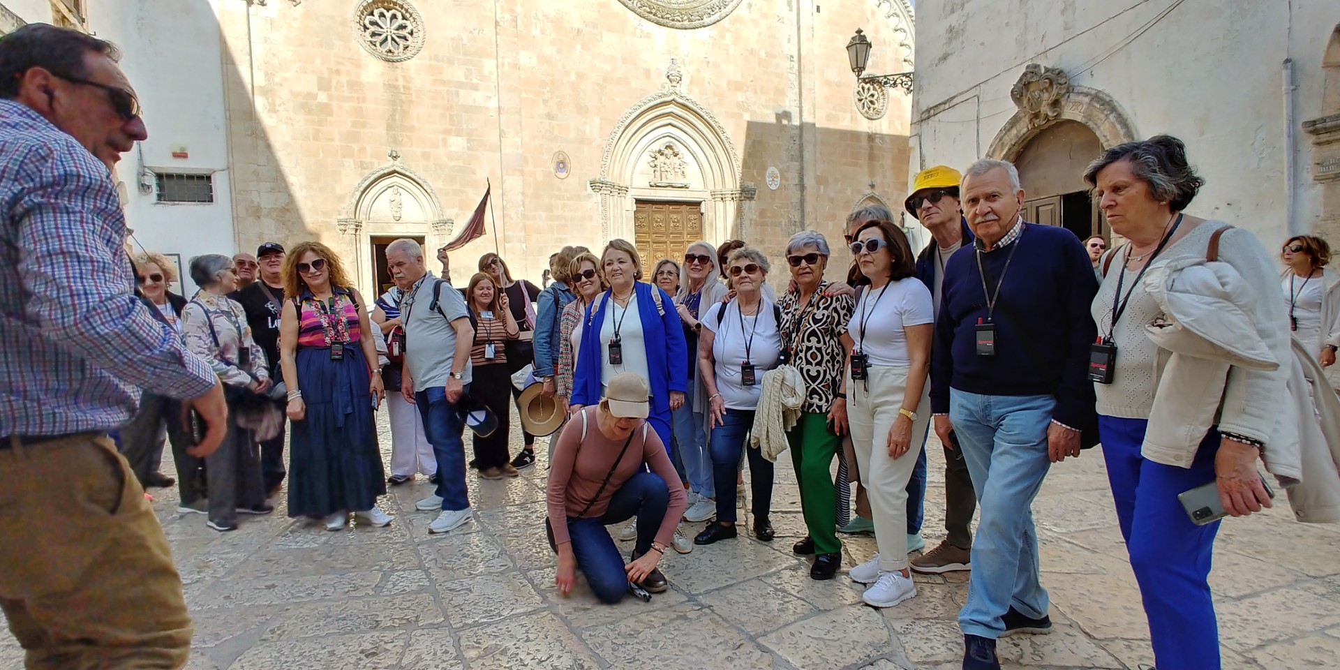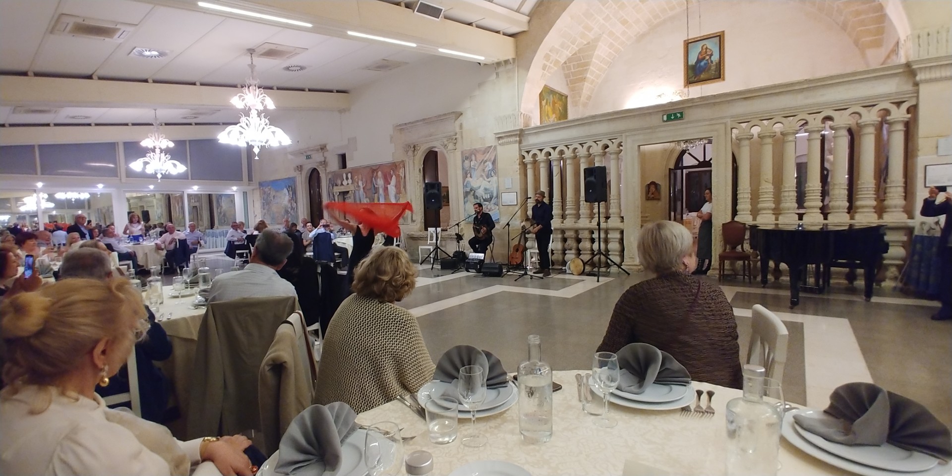 En el segundo día, con pocas horas de sueño iniciamos una visita guiada por la bella región de la Plugia y sus tesoros como Martina Franca repleta de historia y arte y Ostusi otro tesoro de belleza. Por la noche nos esperaba la cena de gala organizada por los compañeros de UNITRE Lecce en un espectacular edificio del siglo XVI. Un lugar con encanto y clase con la combinación de arquitectura unida a la magia de la elegancia y belleza singular de italianas y españolas de ambas universidades dieron una luz a la ceremonia de fraternización. Abrió la cena, un dúo de cantantes del folclore popular y una bailarina que animo a bailar. El lenguaje universal del baile, liberó la timidez inicial y dio paso a la espontaneidad, cogidos de la mano en círculos italianos y españoles danzaban dirigidos por la bella y descalza bailarina. La poesía tuvo su entrada con un poema del poeta local Giuseppe Greco recitado en italiano y Rafael Reche lo leyó en castellano.