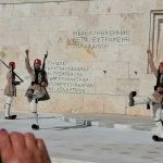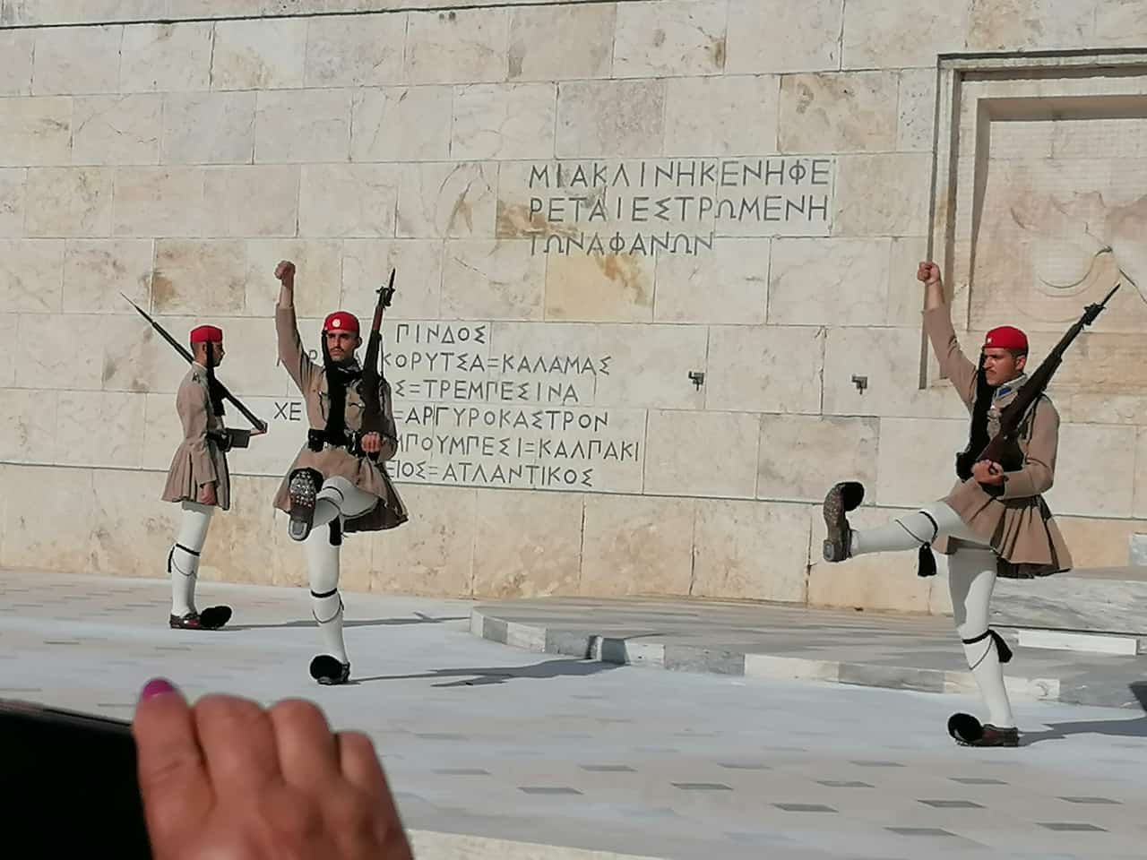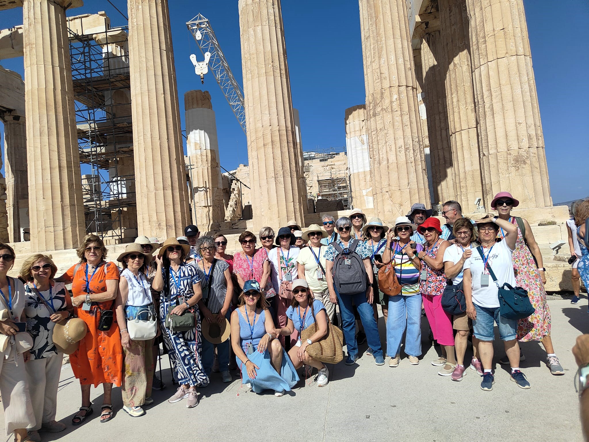 En un vuelo chárter directo desde Málaga a Atenas los expedicionarios iniciaron su aventura, a la llegada a la ciudad se realizó un recorrido en autobús por los emblemáticos edificios en el “corazón del neoclásico”, estadio Panatenaico (donde se celebraron los primeros juegos olímpicos de la historia), la plaza Sintagma con el Parlamento y el monumento al soldado desconocido, a la hora en punto presenciamos el relevo de la guardia con su paso pausado y gestos uniformados los soldados de la Guardia Nacional llamados evzones con su uniforme antiguos (camisola blanca, falda plisada, un chalequillo bordado y un gorro de color rojo con una coleta). Al llegar al hotel para cenar nos recibió una luna llena sobre la silueta iluminada del templo de la Acrópolis, nos alimentó la curiosidad de cuantos secretos guarderías entre sus columnas, regresar a los Dioses y Diosas: Zeus, Hera, Poseidón, Ares, Hermes, Afrodita, Atenea, Apolo y Artemisa.