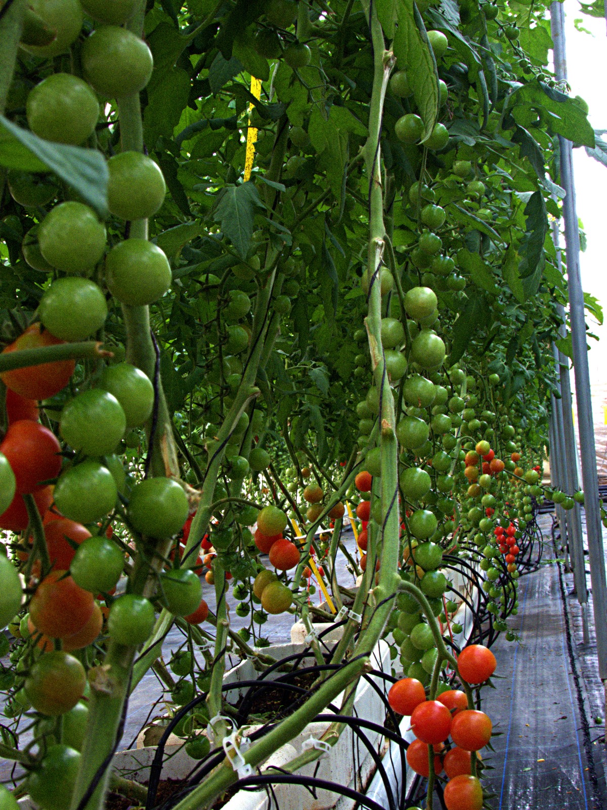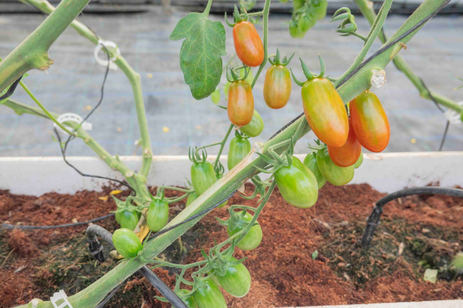 En este invernadero los tomates están en maceteros de fibra de coco, su cultivo es hidropónico y se alimentan “a demanda”, al final de cada invernadero hay un cabezal de riego donde se les agrega hierro, calcio, potasio y micro elementos que necesitan las plantas.