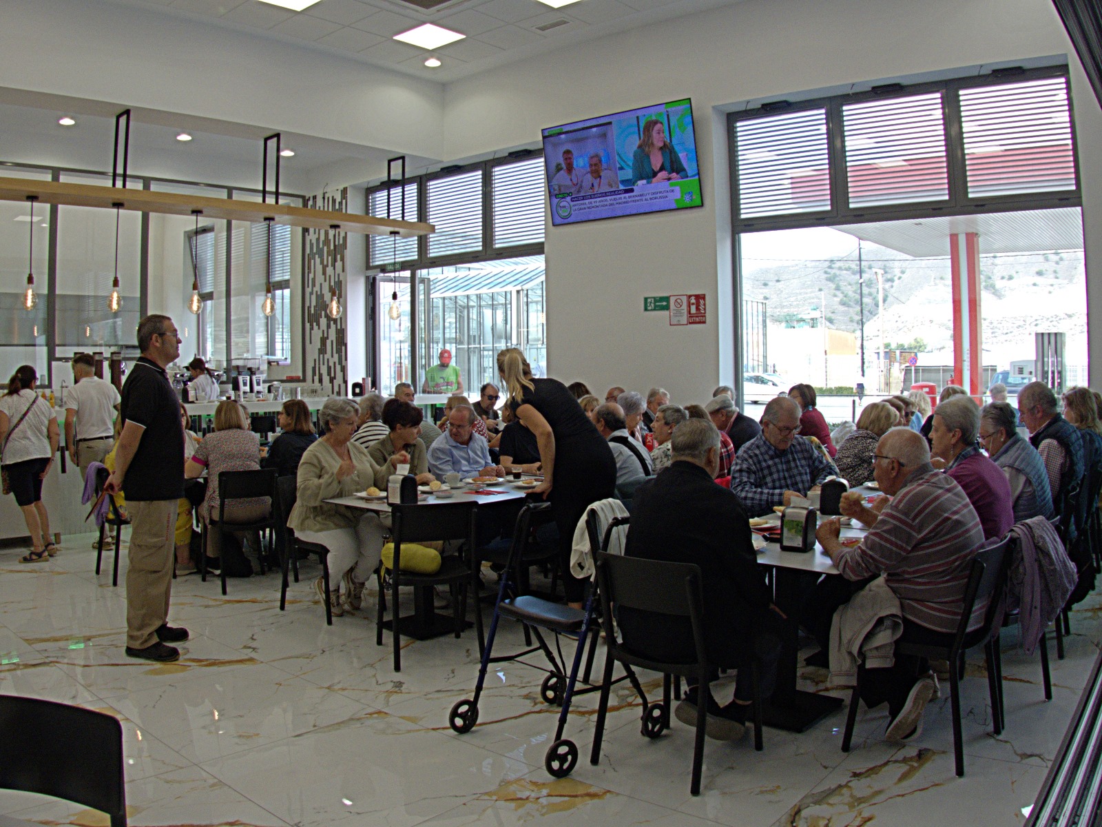 Nos invitan a desayunar café, tostadas, aceite y un magnífico tomate rayado que agradecemos todos.