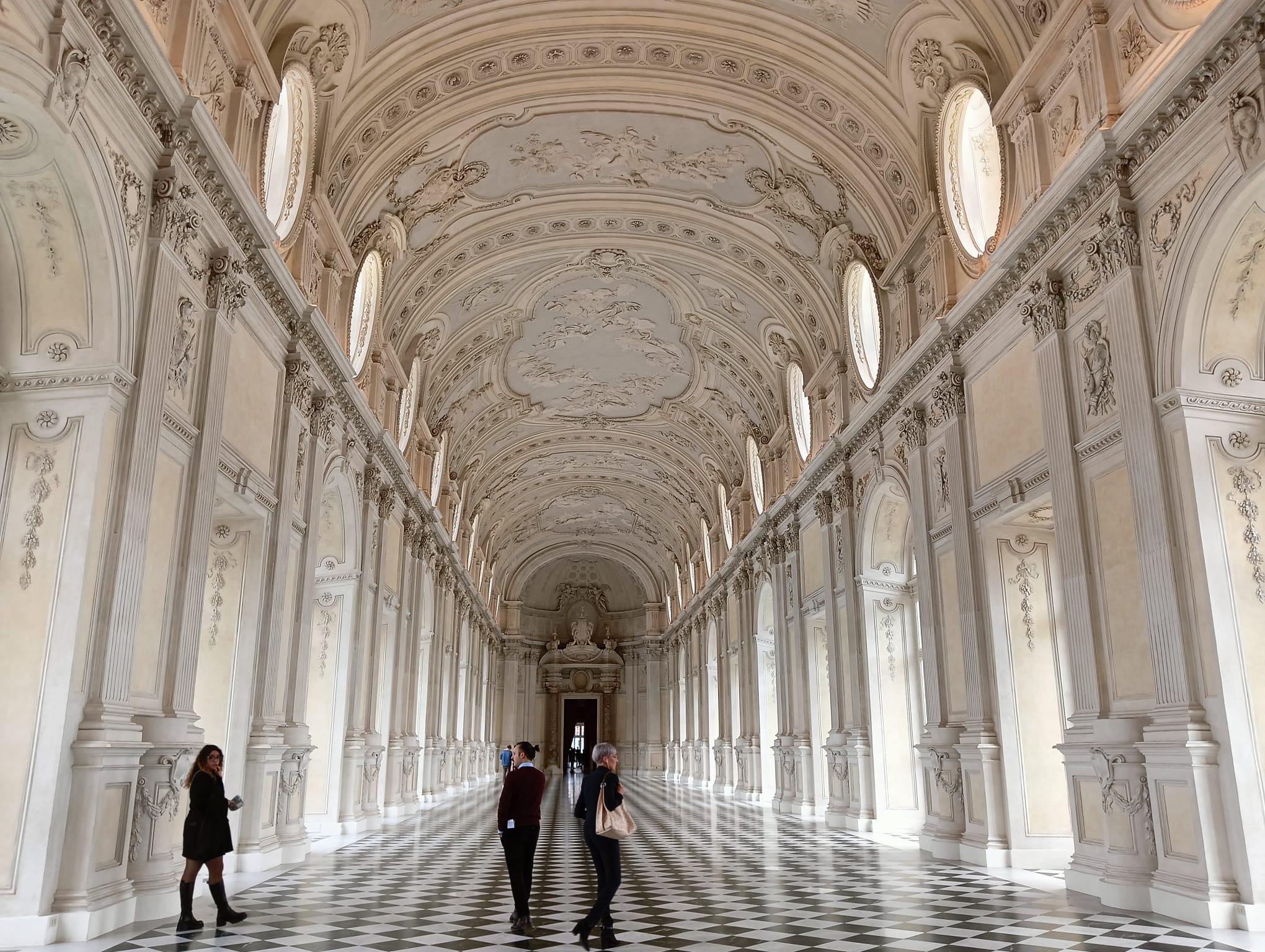 A la mañana siguiente nos desplazamos en autobús hacia la Venaria Reale, palacio de estilo barroco, residencia de placer y de caza de la Casa de Saboya, cuyo interior está decorado con escenas pintadas dedicadas a la caza y a la diosa Diana. El palacio presume de un magnífico salón de baile, llamado la Galería Grande Venari ó también, la Galería de Diana, construido por Filippo Juvara, y que nos maravilló por su perspectiva acentuada con la dirección lineal del suelo, compuesto por baldosas blancas y negras.
