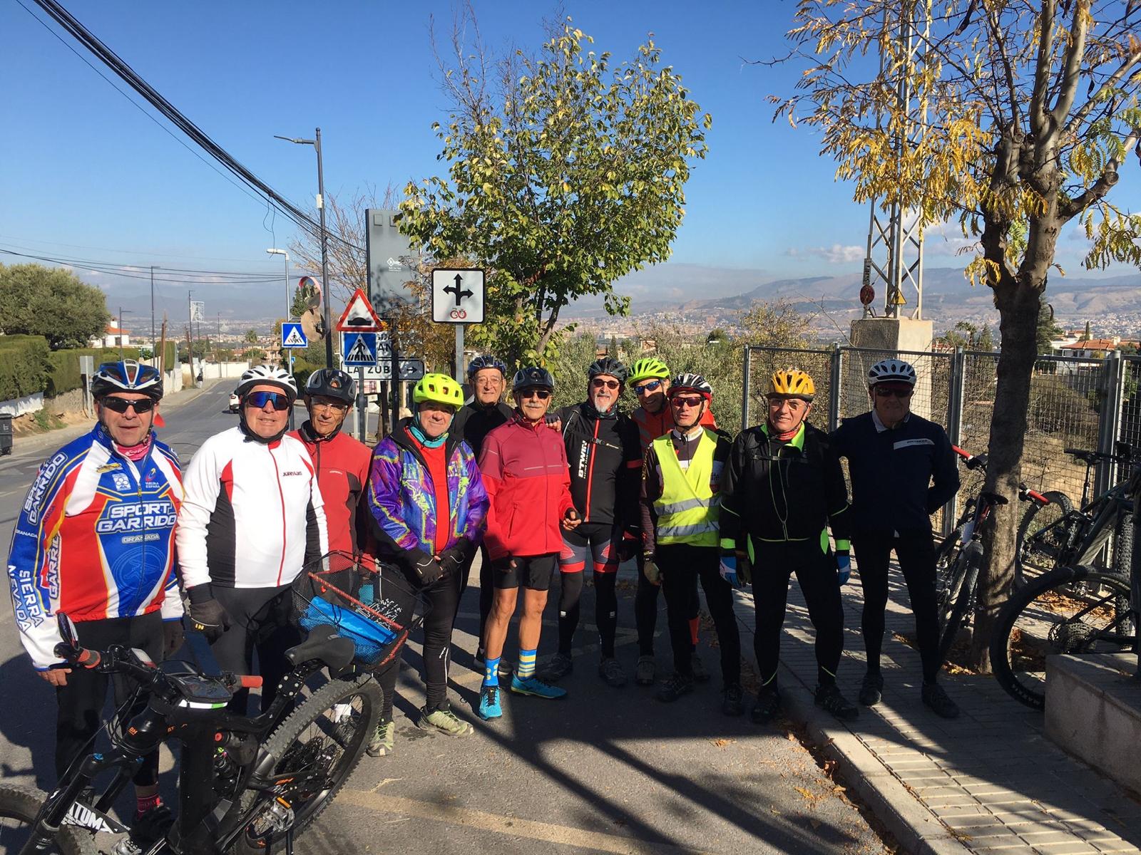 Por carril bici llegamos al PTS, donde cruzamos para enlazar con otro carril bici hasta las afueras de Granada, donde cogimos la carretera de Gójar, que después de una fuerte subida, llegamos a la parada del autobús donde se nos unieron los dos compañeros lque faltaban hasta completar 11.