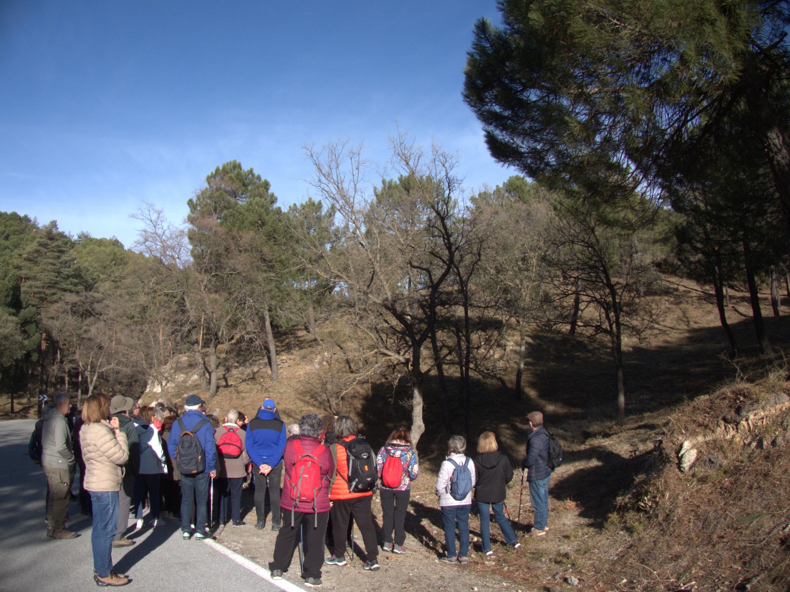 Siguiendo la ruta, nos dejamos a la izquierda, el camino que de seguirlo, nos llevaría a la cueva del Agua. Posteriormente, llegamos a un pinar repoblado y esto se nota por la distribución apelmazada de los pinos. Está forma de bosque conlleva más peligro de incendios y más difícil de sofocar, por la escasa distancia de los árboles, que a su vez no dejan pasar la luz del sol, impidiendo por otra parte el desarrollo de vegetación.