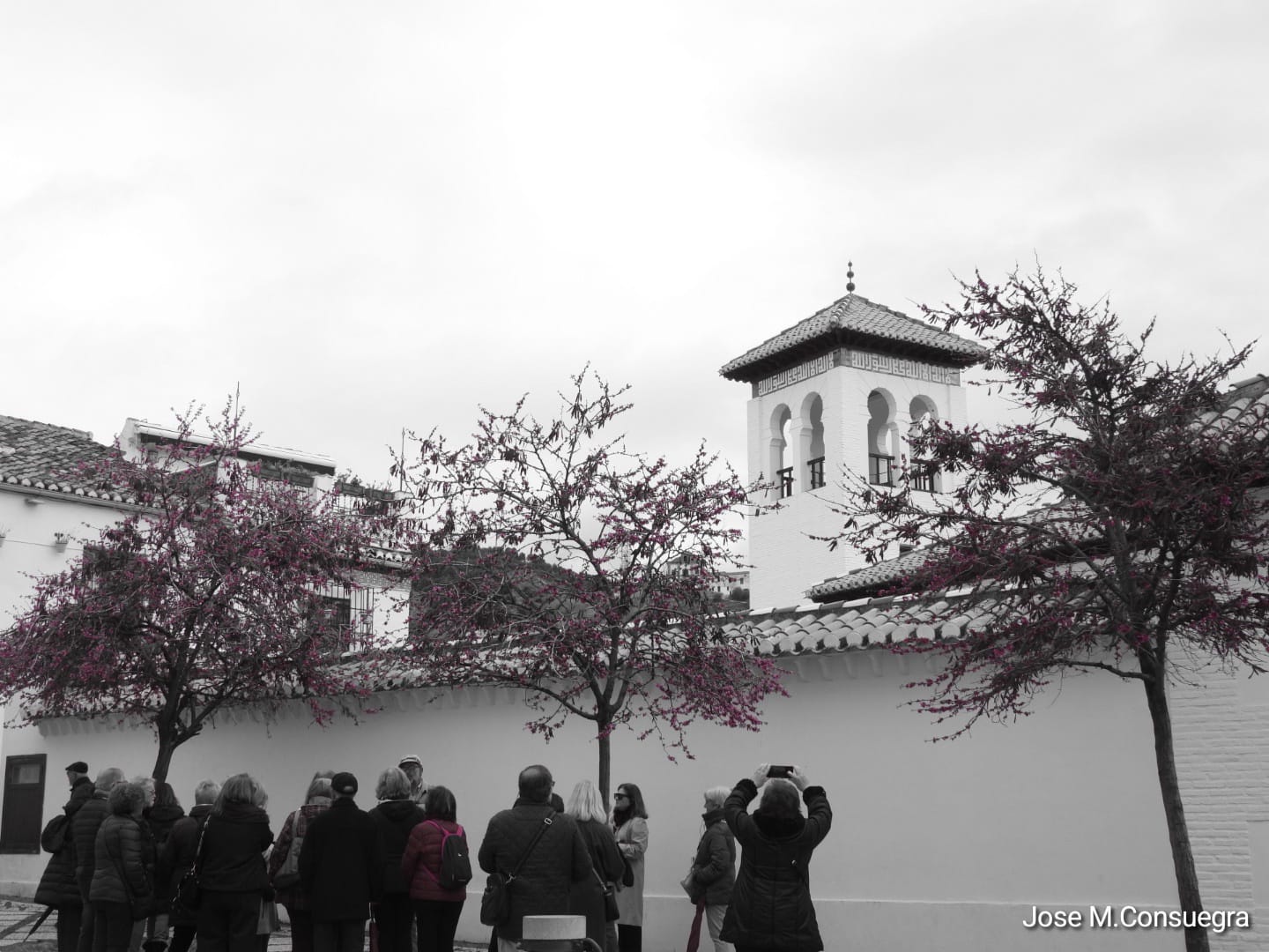 Continuamos nuestra visita recorriendo las callejuelas más estrechas y menos “invadidas por el turismo”, que nuestro guía conoce bien e ilustra con constantes anécdotas y curiosidades del saber popular albaicinero como es el consejo de no pisar sobre las piedras blancas del pavimento, procedentes del Darro y hacerlo por las procedentes del Genil, negras y menos resbaladizas.