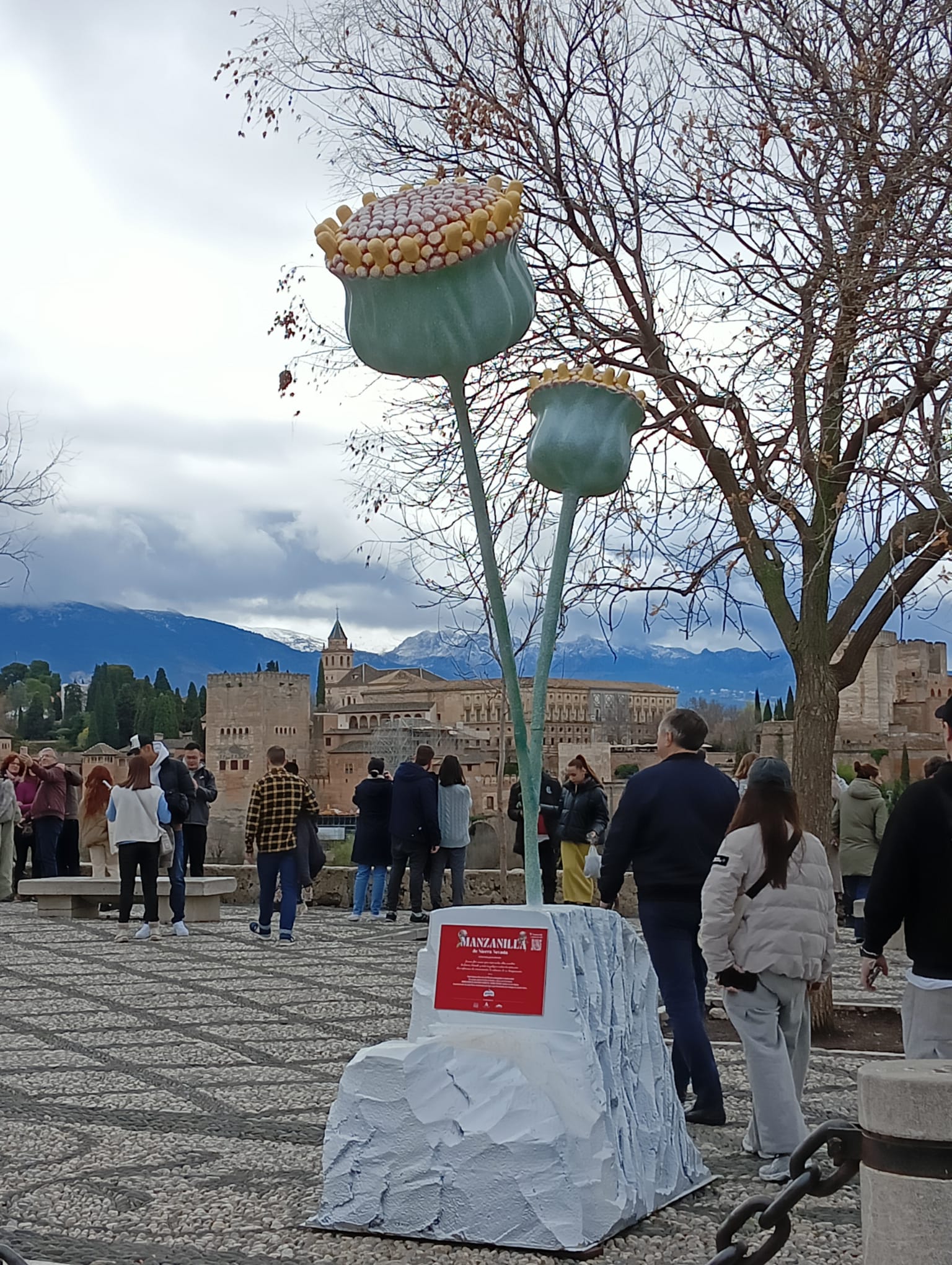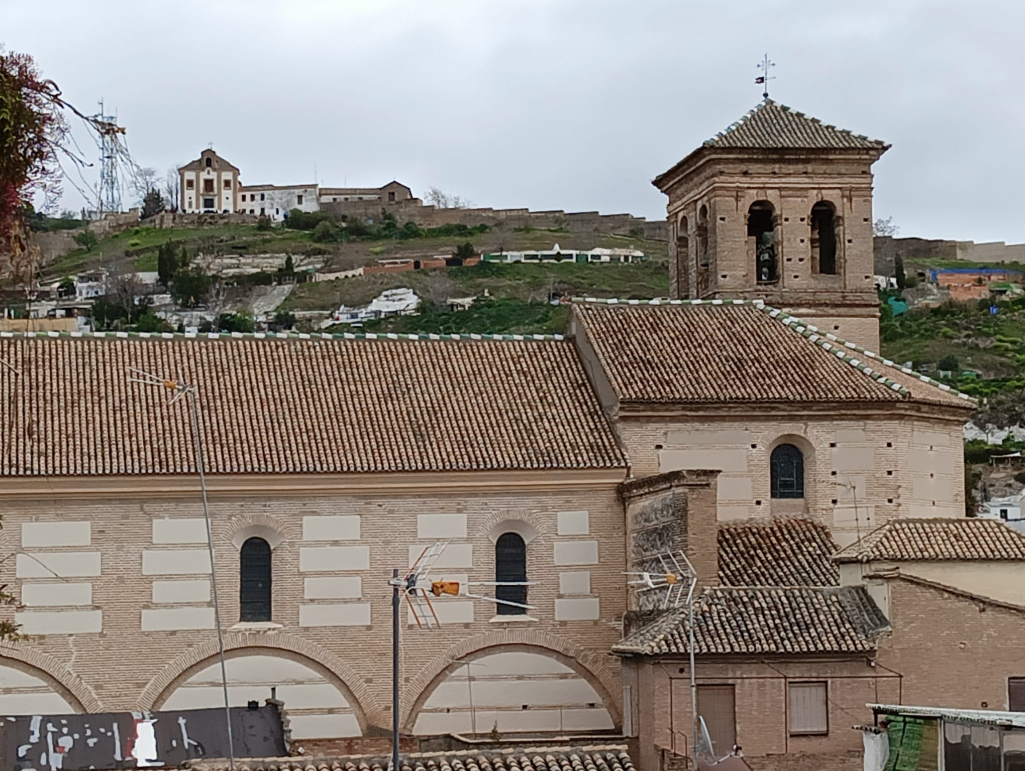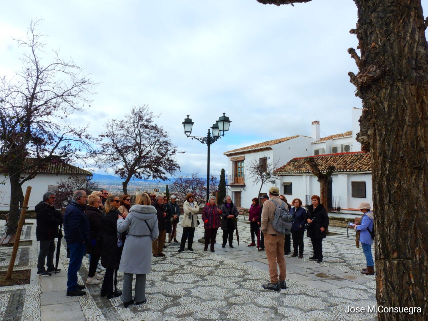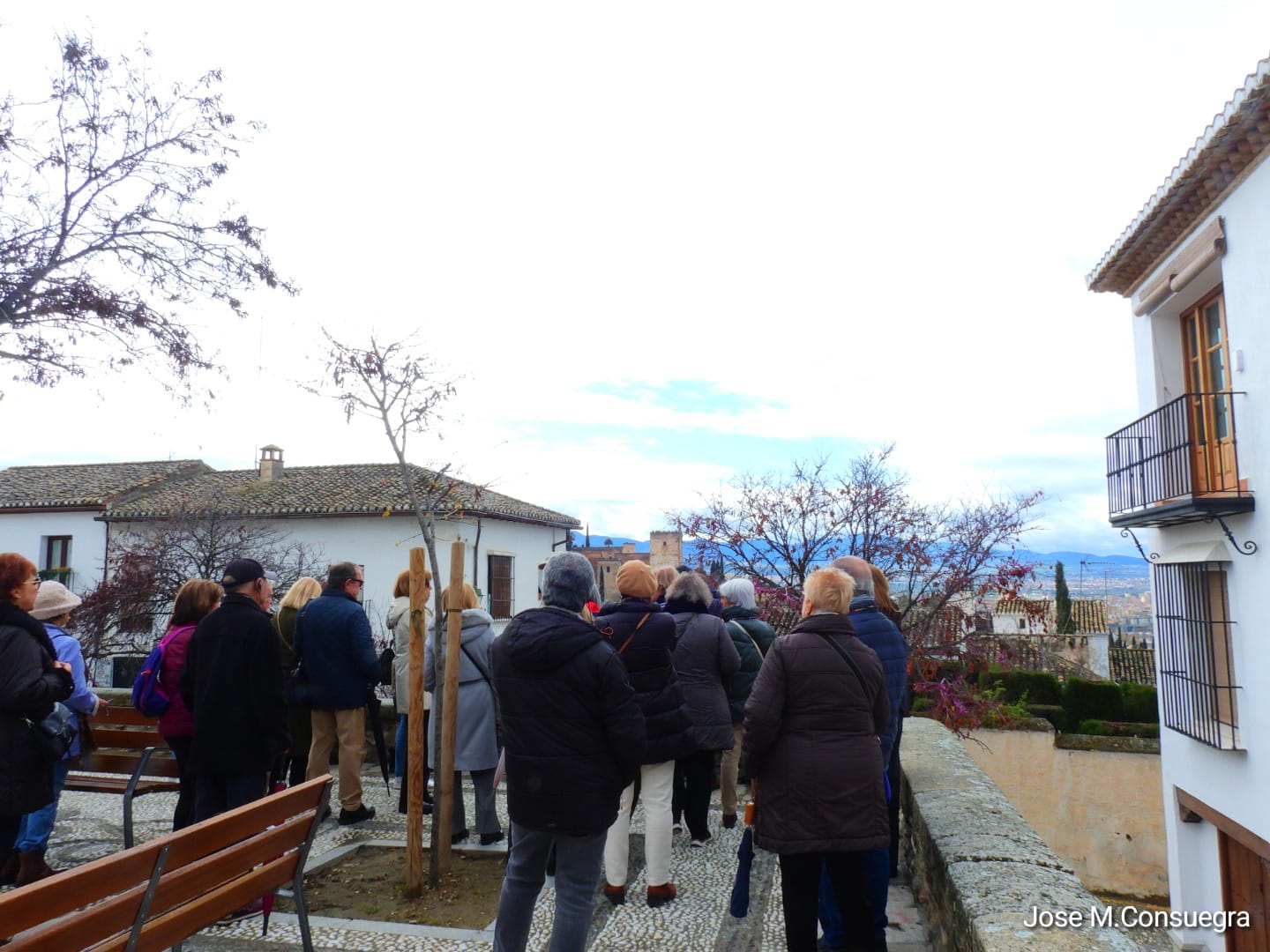 El grupo de 30 personas llega puntualmente al lugar de encuentro: la Plaza de San Nicolás, a escasos metros del mirador. Es una plaza recoleta, tranquila, agradable, presidida por el Colegio Gómez Moreno que hoy aporta el silencio propio del descanso de la actividad escolar. Damián, orgulloso de sus orígenes albaicineros, nos anima a disfrutar de este espacio no invadido, de momento, por lo que él llama: turismo de bajada, tan de moda en los últimos tiempos. Muy cerca, el Carmen de Atarazanas, antiguo cine de verano del barrio en los años 60. Nos recuerda Damián el significado del término “atarazanas” como el lugar relativo a la fabricación de cuerdas ligado al cultivo del lino en la Vega.