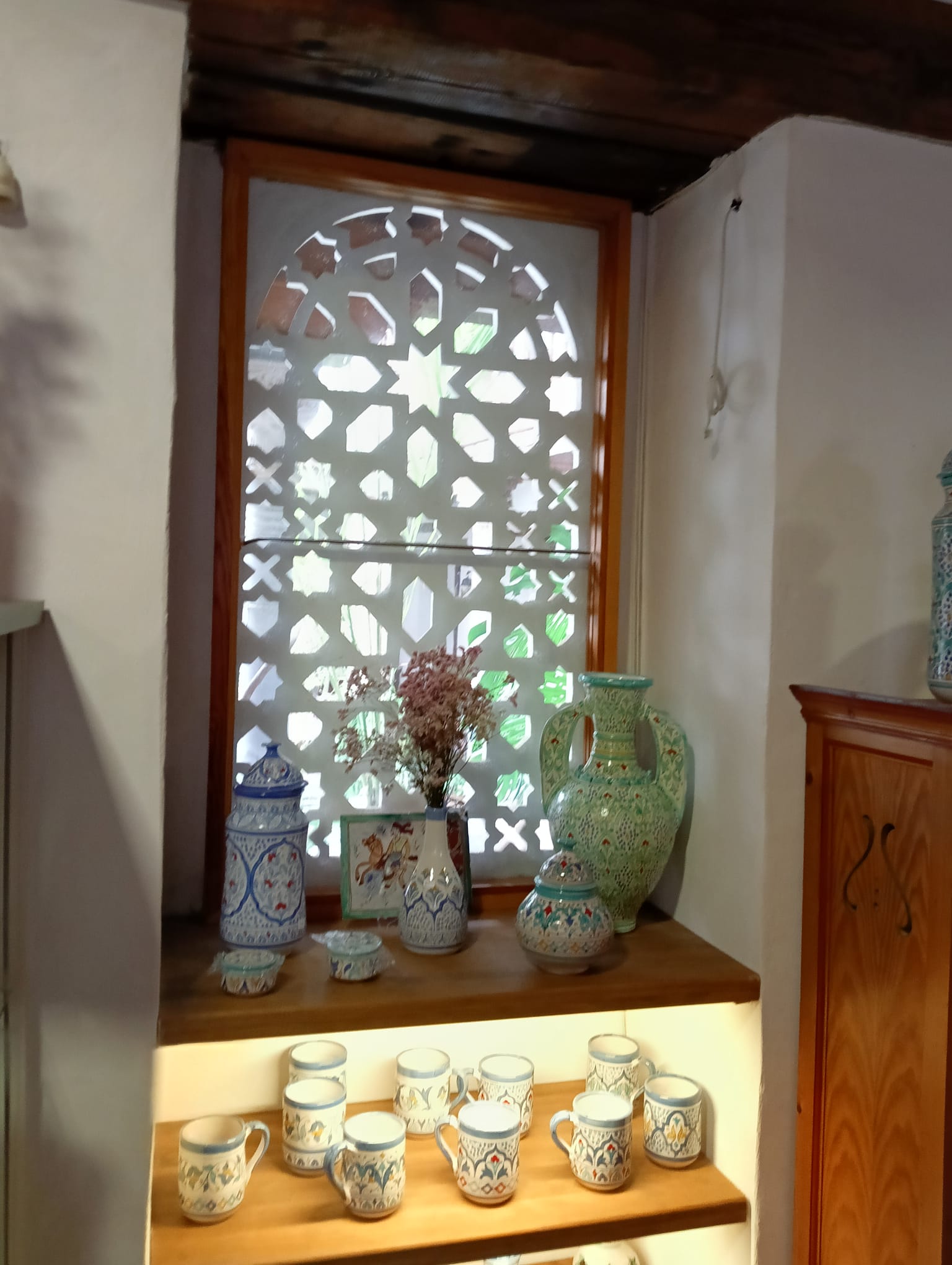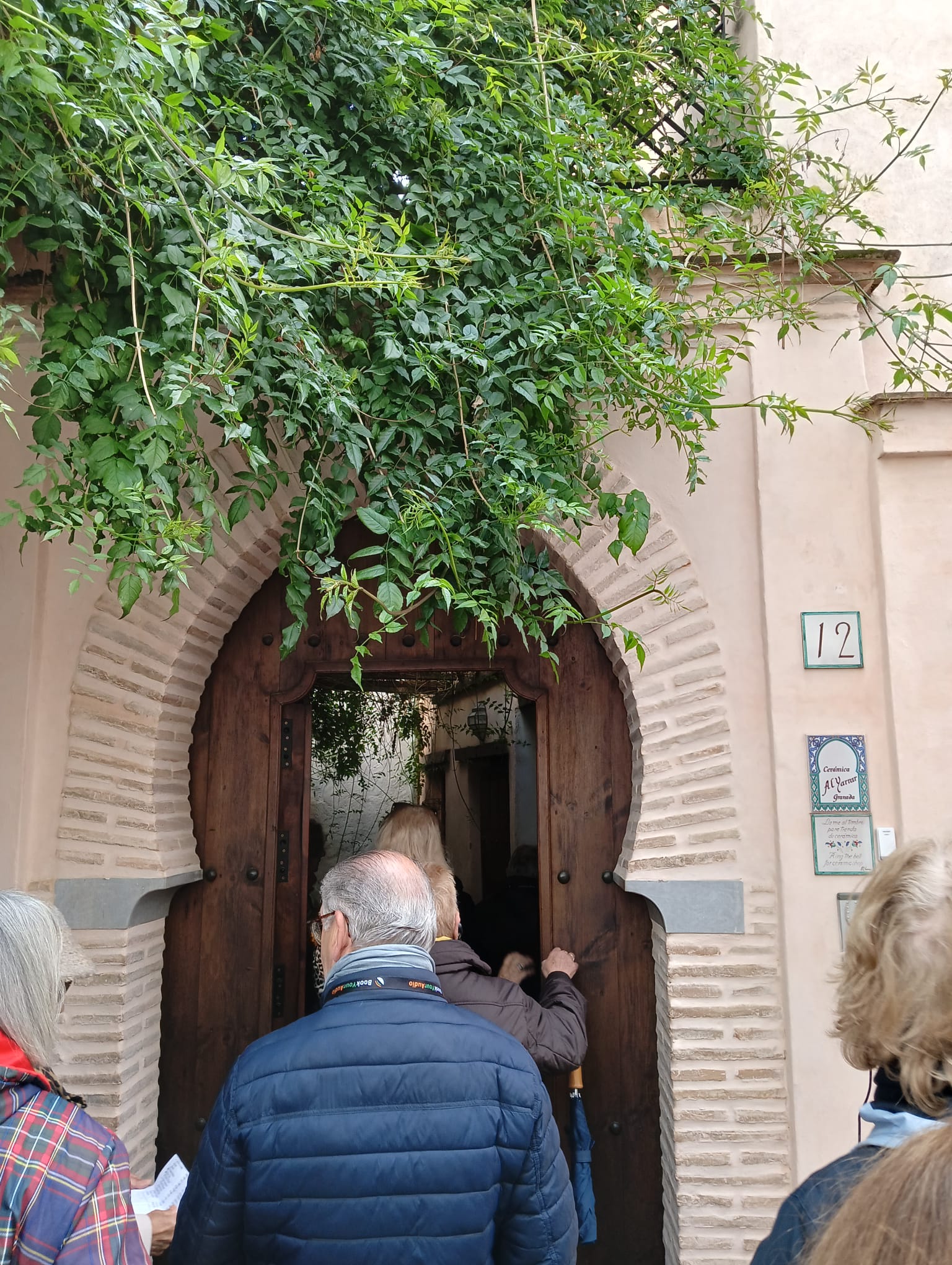 El paseo continúa hasta Iglesia de San Bartolomé, visitando previamente una casa morisca rehabilitada de forma respetuosa tanto en su fachada como en su interior. Nos detenemos en su patio interior, un patio con alberca central, oculto a las miradas del exterior fiel exponente de la tradición musulmana. Isabel, su dueña, nos muestra los objetos de cerámica que realizan en el taller Al-Yarrar rescatando fielmente la tradición nazarí. Como objeto emblemático la reproducción del jarrón de las Gacelas que se conserva en el Museo de La Alhambra.