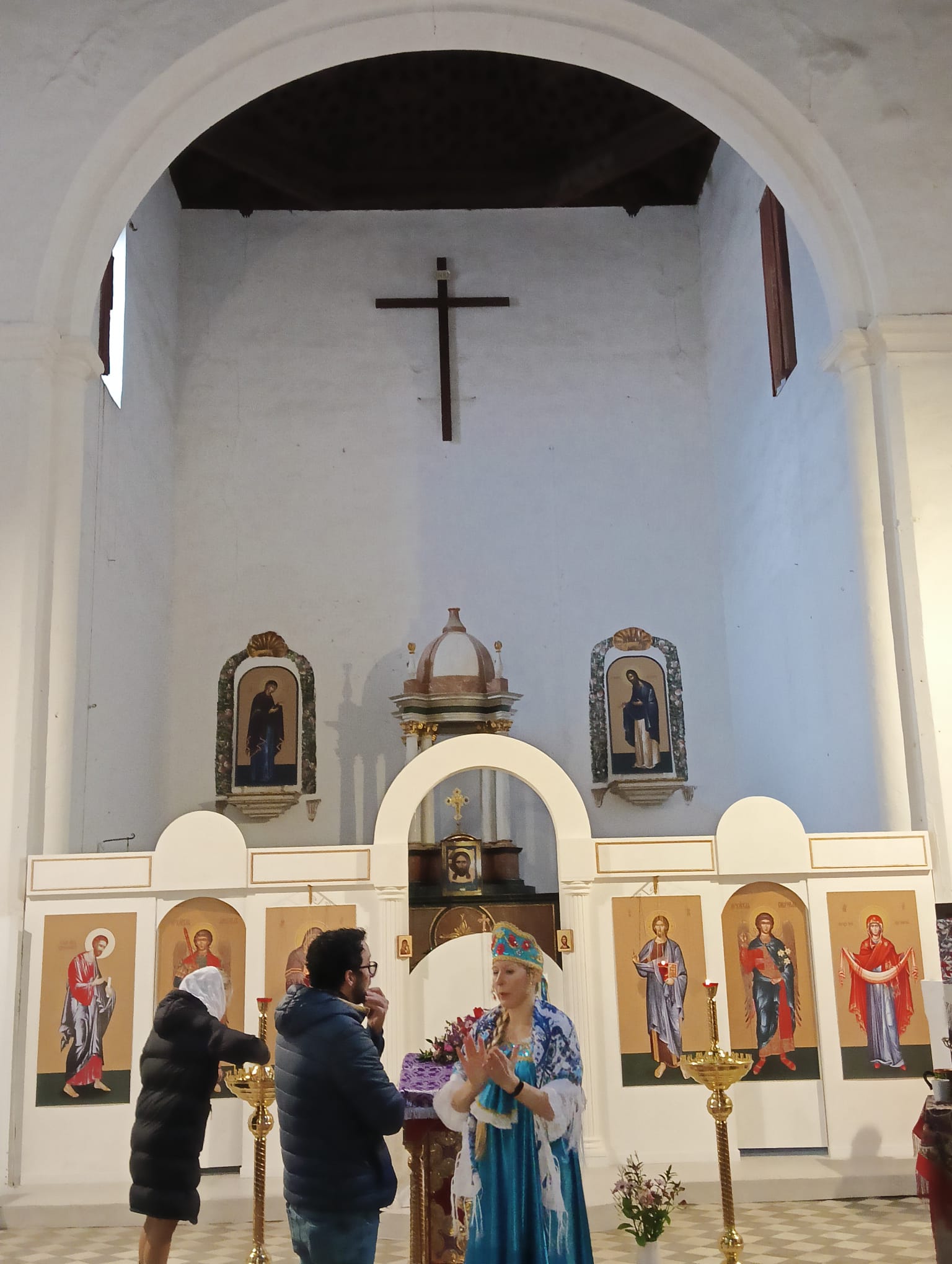 La iglesia de San Bartolomé es una construcción del renacentismo mudéjar granadino. De una sola planta, sin capillas laterales, con cubierta de tradición mudéjar. Su torre destaca por sus cinco órdenes de ventanas todas distintas y decoradas con azulejería y molduras de separación de los tres pisos. Desde 1842 está suprimida como parroquia. Actualmente acoge el culto de la comunidad ortodoxa rusa en Granada adoptando la estética propia de esa liturgia. Una de las componentes de esta comunidad y miembro del coro, nos da la bienvenida y nos explica las muchas similitudes existentes entre su credo y el de la iglesia católica, ambas cristianas y procedentes del mismo Evangelio de Jesucristo. Tras el encendido de velas por cada uno de los asistentes y de escuchar un bonito recital de canciones litúrgicas y populares interpretadas por el dúo formado por dos mujeres .una rusa y una ucraniana, nos despedimos no sin antes degustar el vino especiado y los dulces con los que nos han obsequiado. Una bonita experiencia la de este domingo que ha sido indulgente con el grupo pues ha esperado el fin del paseo para enviarnos un nuevo chaparrón.