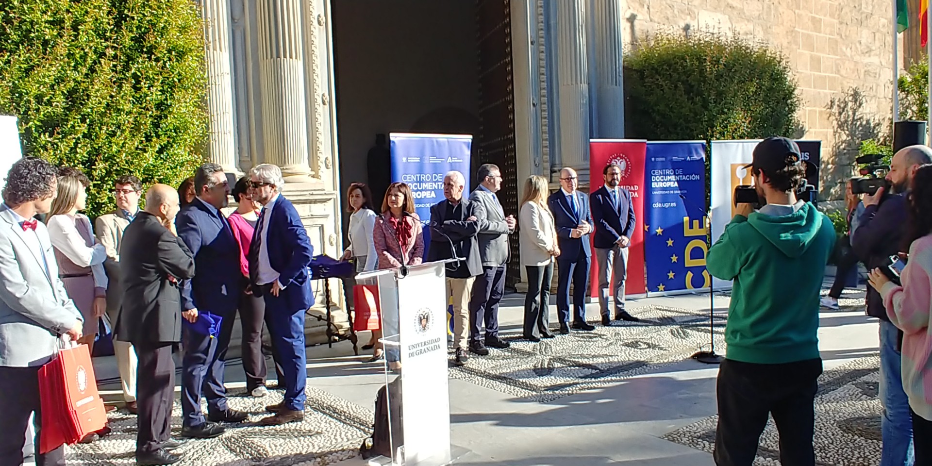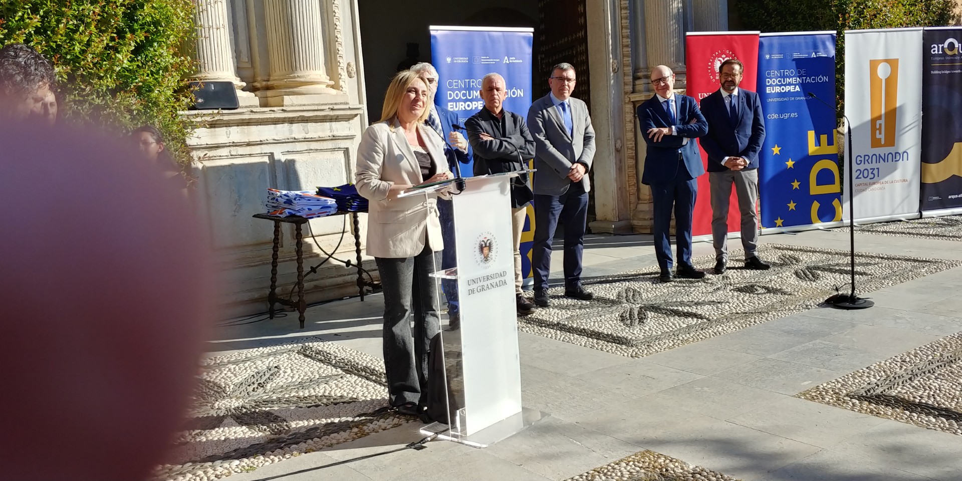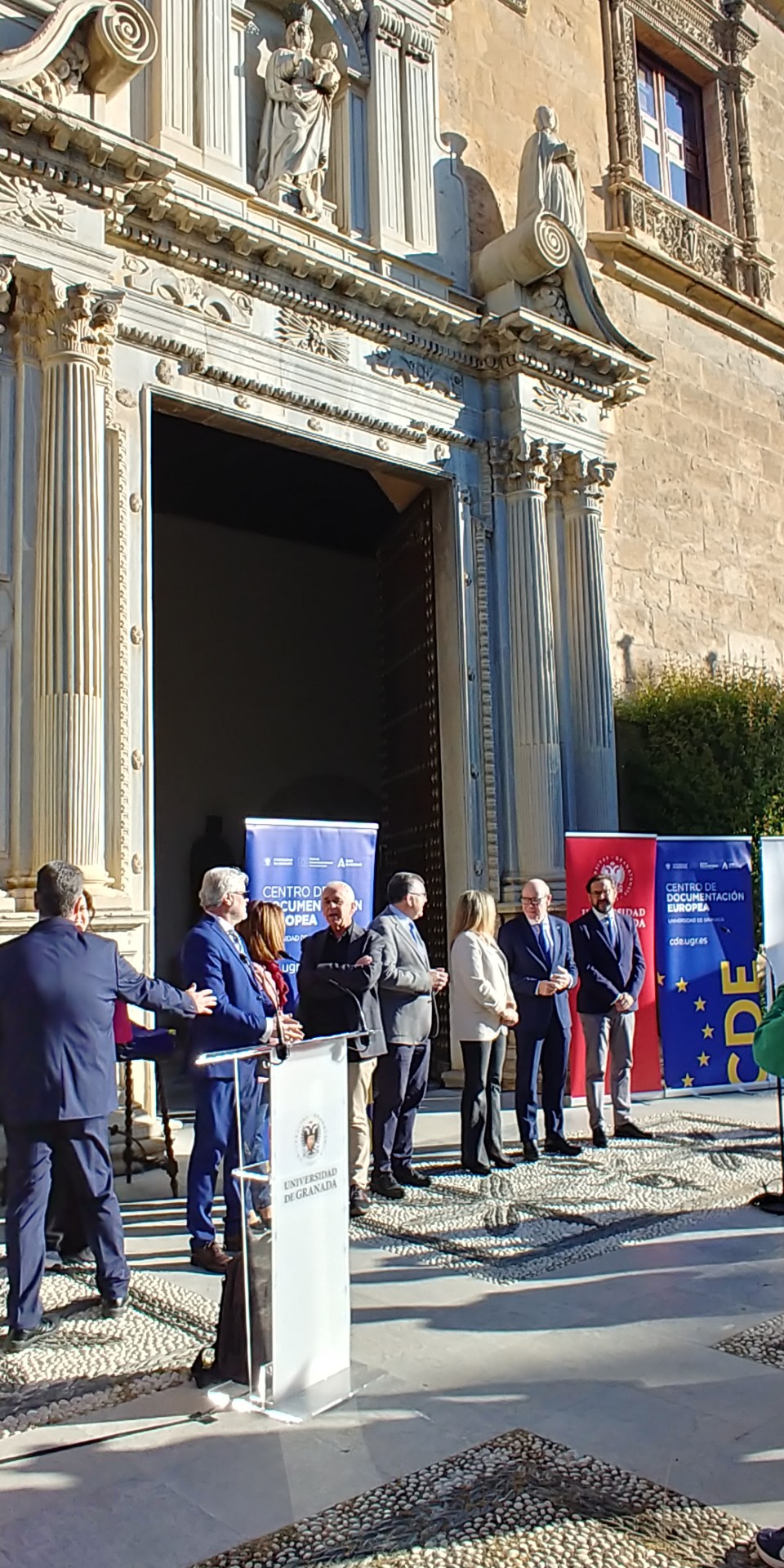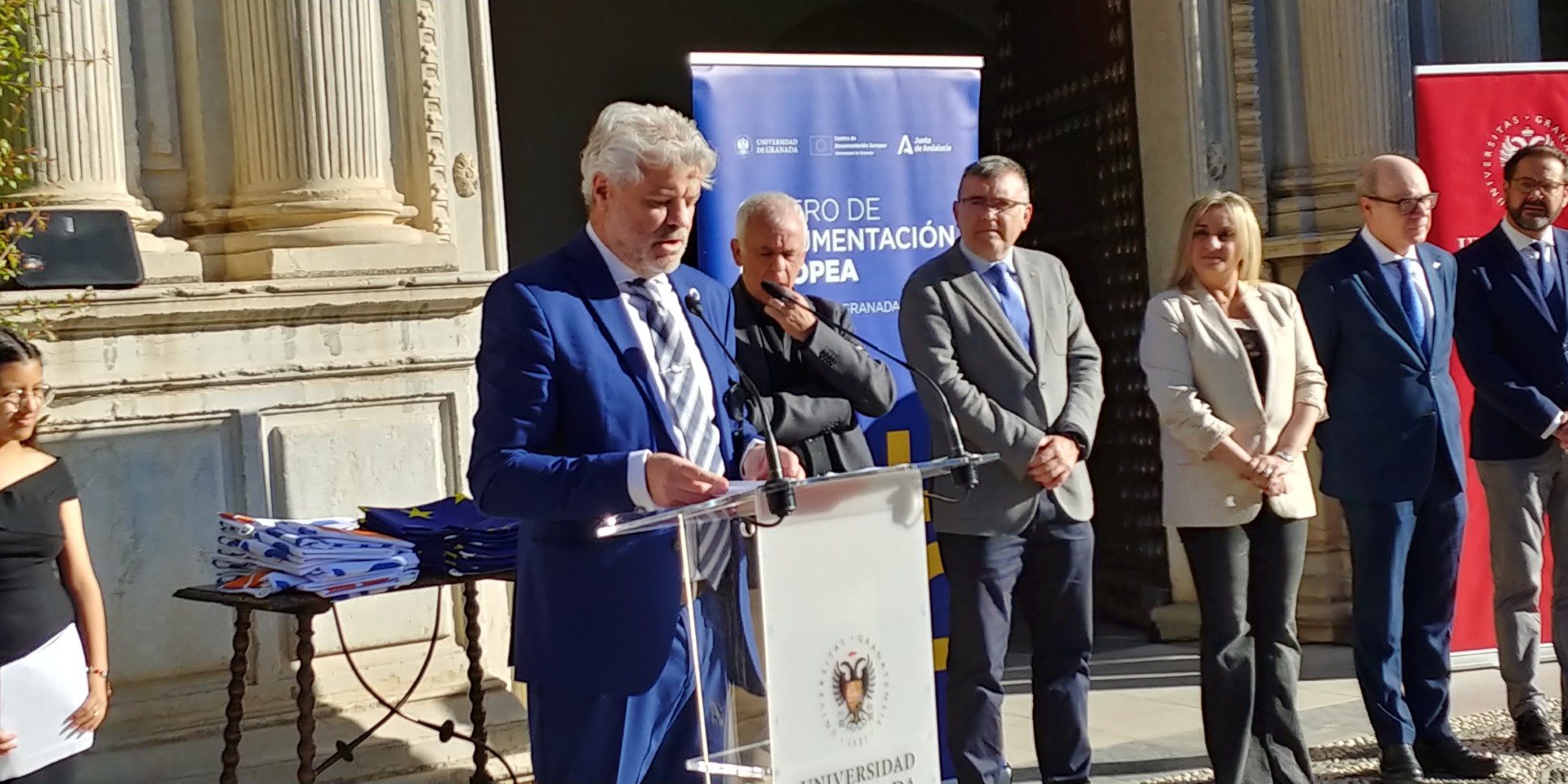En una espléndida y soleada mañana, hemos celebrado con entusiasmo el Día de Europa en los jardines de la monumental entrada del Hospital Real, sede del Rectorado de la Universidad de Granada.
