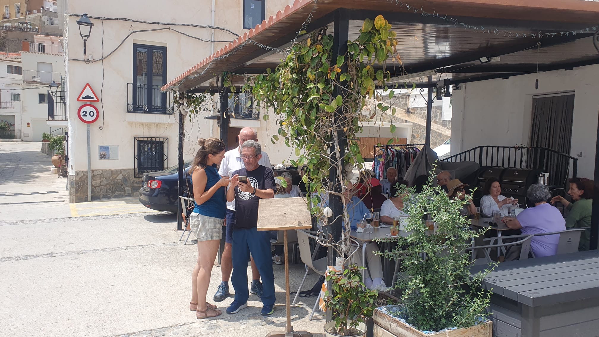 Después de visitar la iglesia, nos dirigimos a comer al «Bar Restaurante Julia Polopos». Está en la plaza en los bajos del ayuntamiento. Estos bajos fueron las escuelas de los niños de Polopos. Yo fui al colegio hasta los catorce años aquí, entonces habíamos más de 60 niños; también venían de los diferentes cortijos del entorno: de Los Garcías y de Las Casillas…Julia y sus socios nos atendieron muy bien; ya habíamos elegido el segundo plato, choto o salmón. Las mesas y las sillas bajo los toldos, para que no nos diera el sol. Estuvimos en la gloria comiendo del «maná»