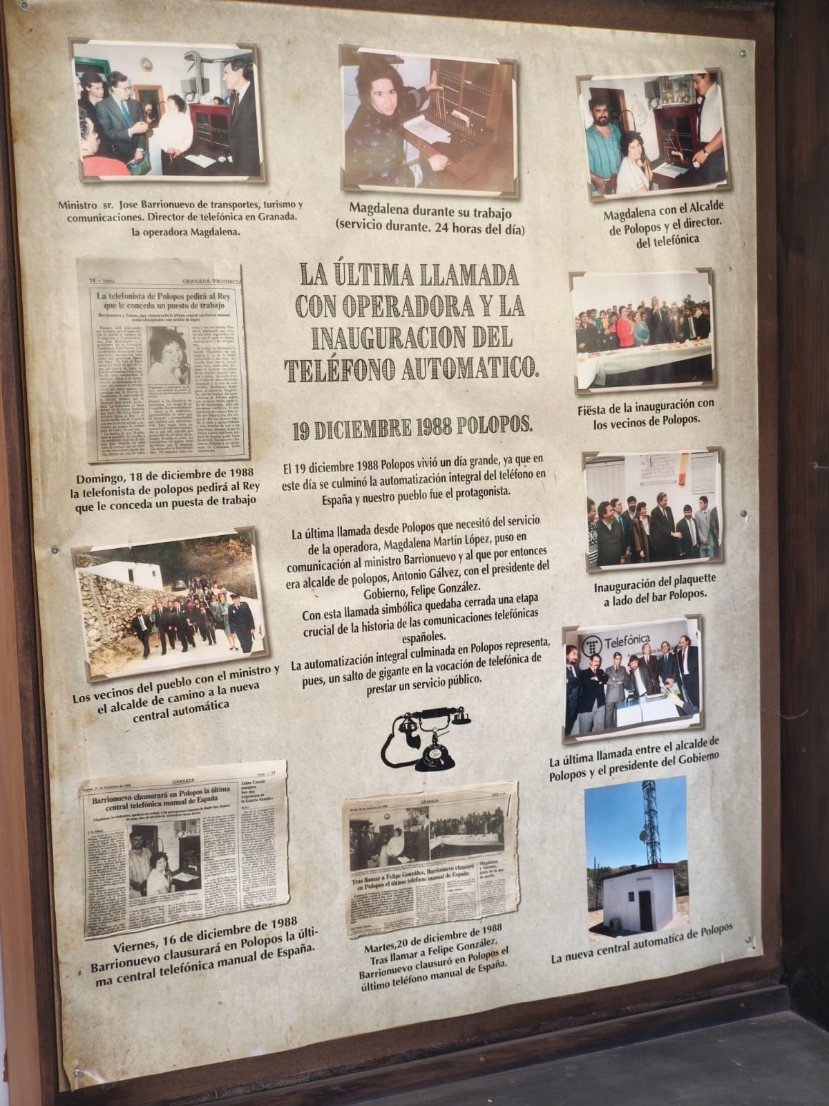 «En 1988, el ministro José Barrionuevo y el presidente de Telefónica Luis Solana acuden a Polopos para despedir la última centralita manual de teléfonos que seguía en funcionamiento y dar la bienvenida a la nueva central automática…»