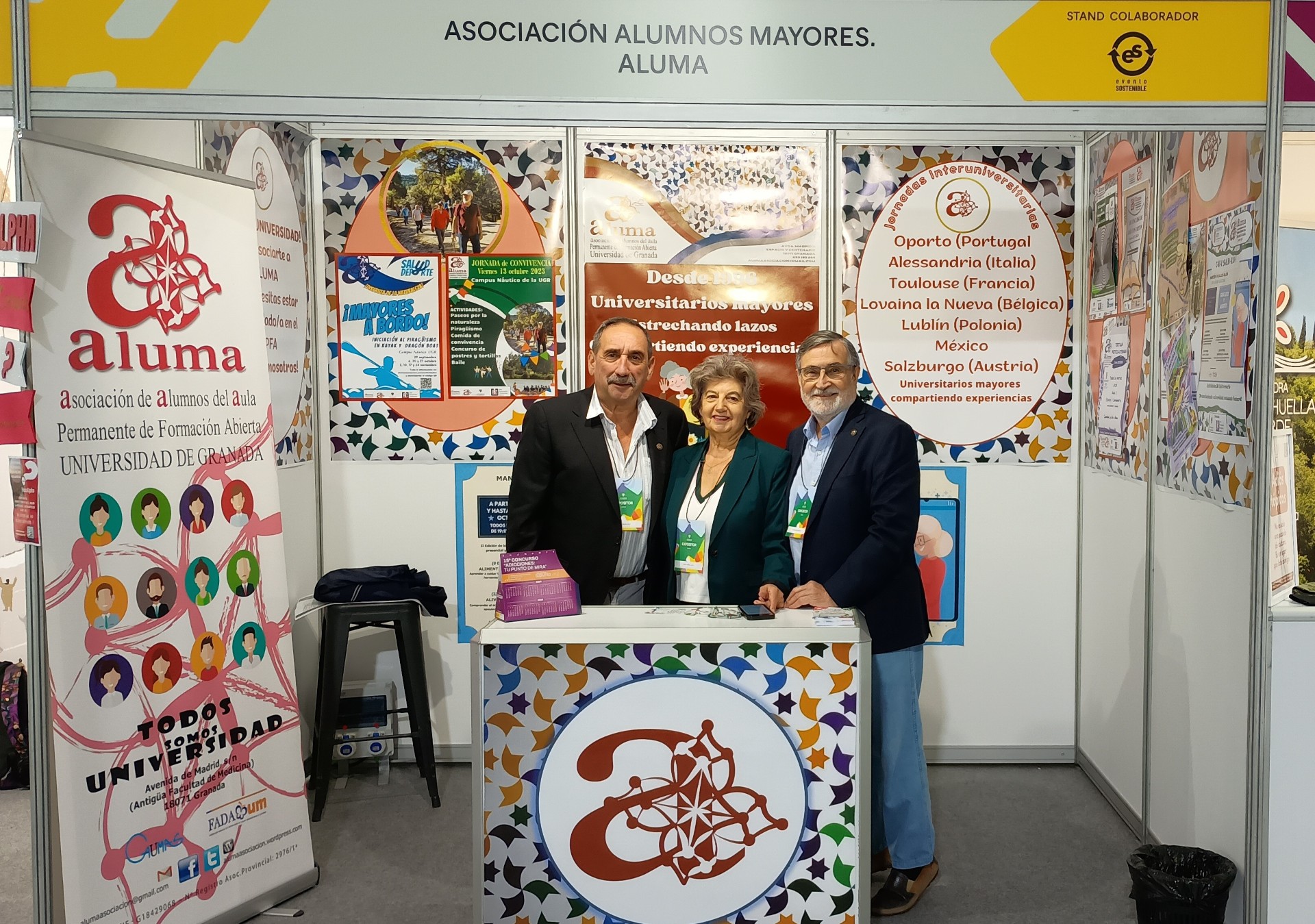 Como en cada edición, ALUMA cuenta con un stand propio desde el que da a conocer al alumnado joven las actividades que la asociación desarrolla junto al estudiantado sénior del Aula Permanente de Formación Abierta (APFA) de la Universidad de Granada.