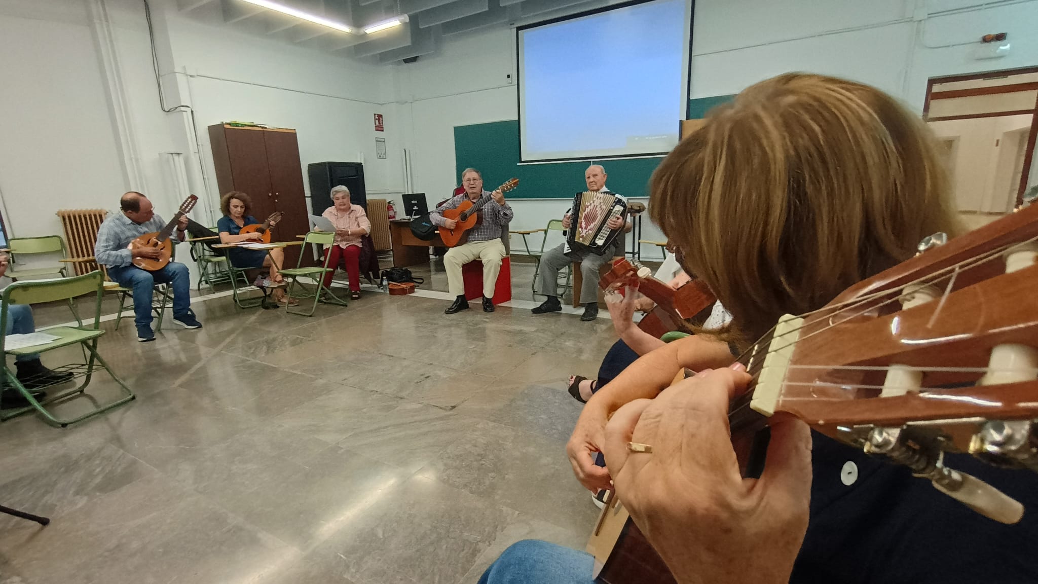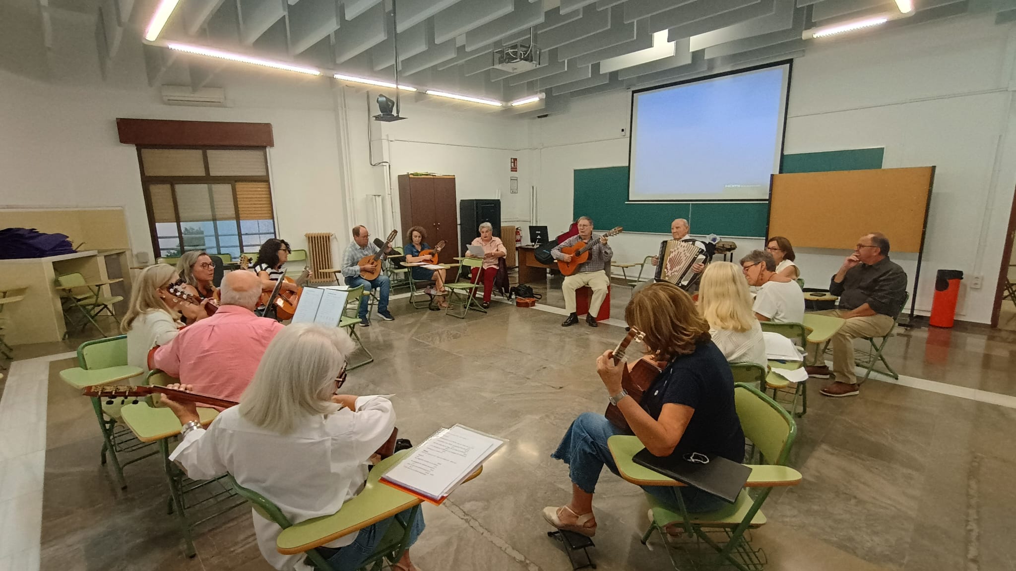 Bajo la dirección de Antonio Guardia, el grupo de entusiastas participantes del Aula Permanente de Formación Abierta dedica tiempo y pasión a estudiar, ensayar y compartir repertorios que llenan el aula de ritmo, alegría y compañerismo.