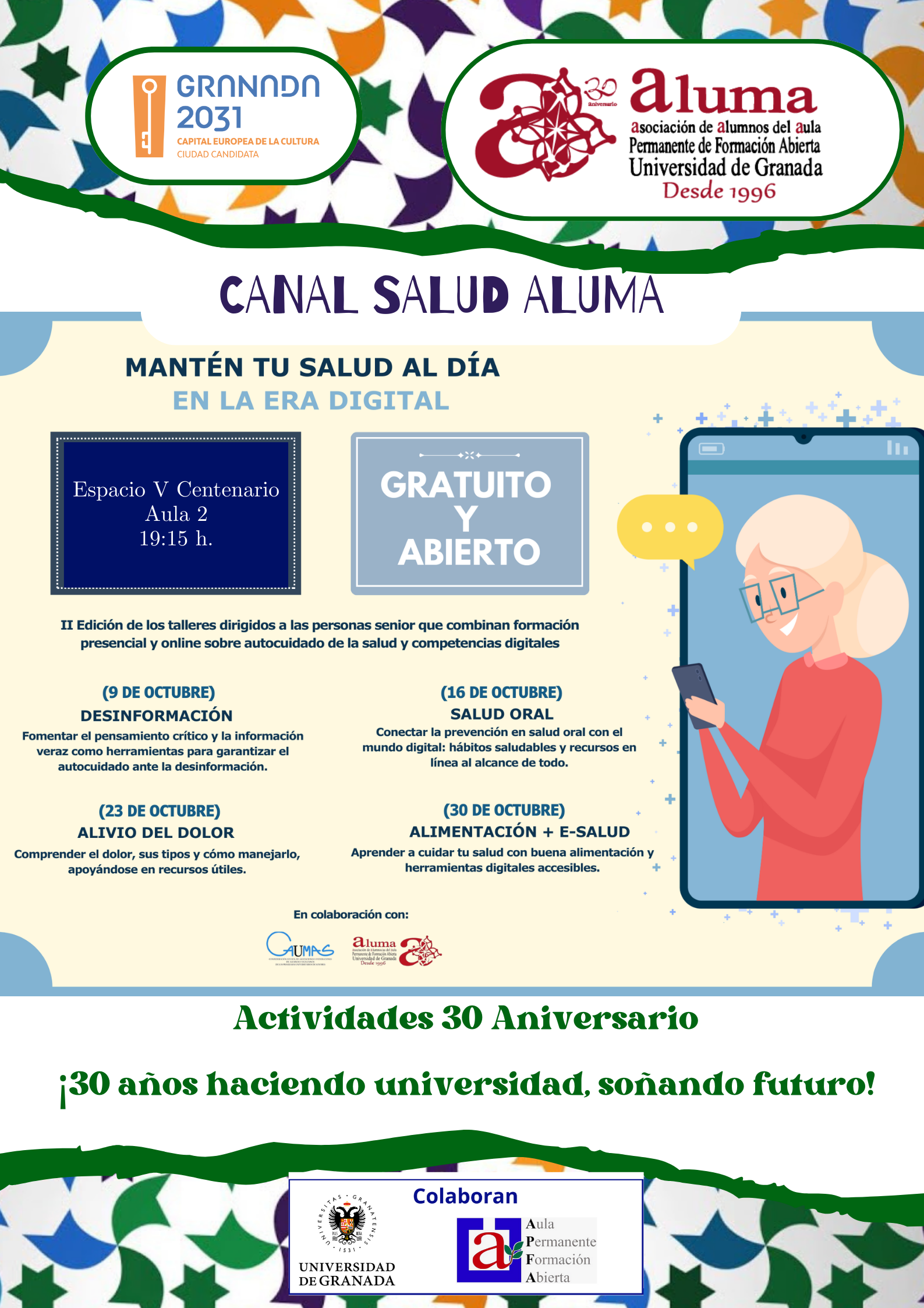 Durante todos los jueves de octubre —días 9, 16, 23 y 30— el Espacio V Centenario de la Universidad de Granada acogió esta iniciativa dirigida a personas mayores de 60 años, que combina la formación en salud con el aprendizaje de competencias digitales.