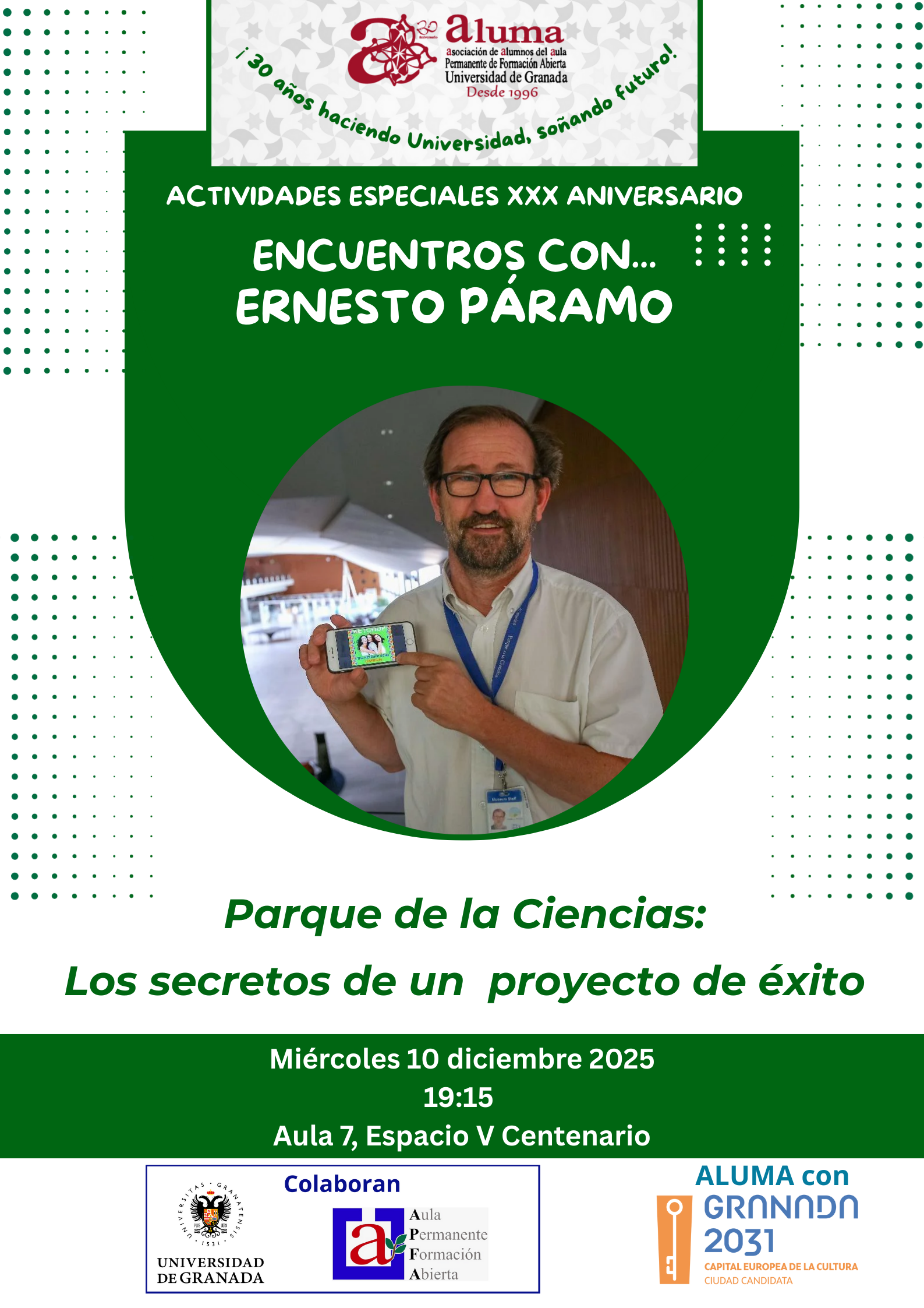 En el marco del XXX Aniversario, ALUMA continúa dando a conocer el valioso patrimonio cultural, artístico y científico de Granada. Y hoy queremos expresar nuestro agradecimiento más sincero a Ernesto Páramo por su generosa colaboración y por compartir con nosotros la apasionante historia de un proyecto que ha hecho de la ciencia una experiencia cercana, humana y profundamente educativa.