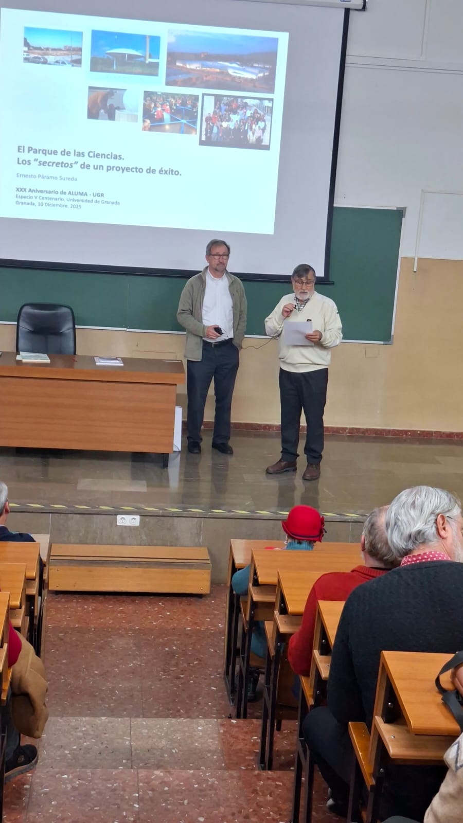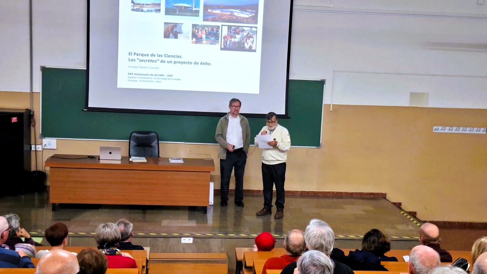 Ernesto habla del Parque de las Ciencias con la emoción de quien lo ha vivido desde dentro. Ya no ocupa la dirección, pero el proyecto forma parte de su biografía más íntima; como él mismo transmite, lo lleva “metido en los huesos”. Su intervención esta tarde ha sido magistral: ha conseguido contagiar su entusiasmo y recordar por qué el Parque de las Ciencias es hoy un referente entre los museos interactivos de España y Europa, un espacio dinámico que ha transformado la manera en que Granada se relaciona con el conocimiento científico.