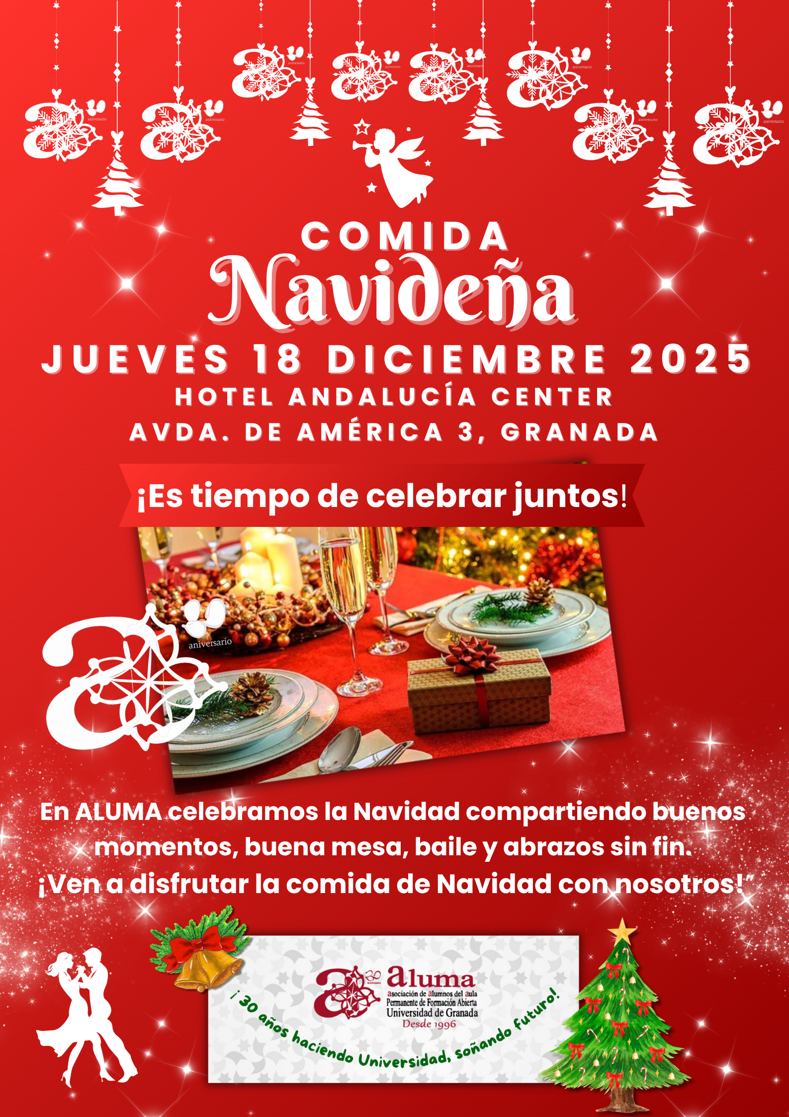 El pasado jueves, 18 de diciembre, 170 socios de ALUMA, la Asociación de Alumnos Mayores del Aula Permanente de Formación Abierta (APFA), celebraba en el Hotel Andalucía Center su comida navideña con la que despedía el primer trimestre del presente curso 2025/2026, con el lema «¡Es tiempo de celebrar juntos!». Igualmente en el cartel de la actividad se indicaba que «en ALUMA celebramos la Navidad compartiendo buenos momentos, buena mesa, baile y abrazos sin fin. ¡Ven a disfrutar la comida de Navidad con nosotros!».