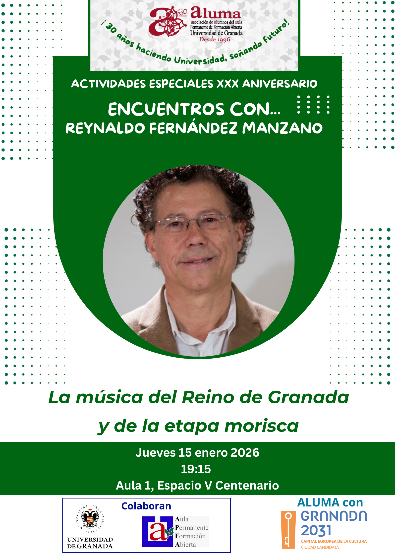 En el marco de las actividades conmemorativas del XXX Aniversario de la fundación de ALUMA, el ciclo Encuentros con… ofreció una de sus citas más relevantes con la conferencia La música del Reino de Granada y de la etapa morisca, impartida por Reynaldo Fernández Manzano, una de las máximas autoridades en el estudio de la música andalusí y del legado musical hispano-musulmán.